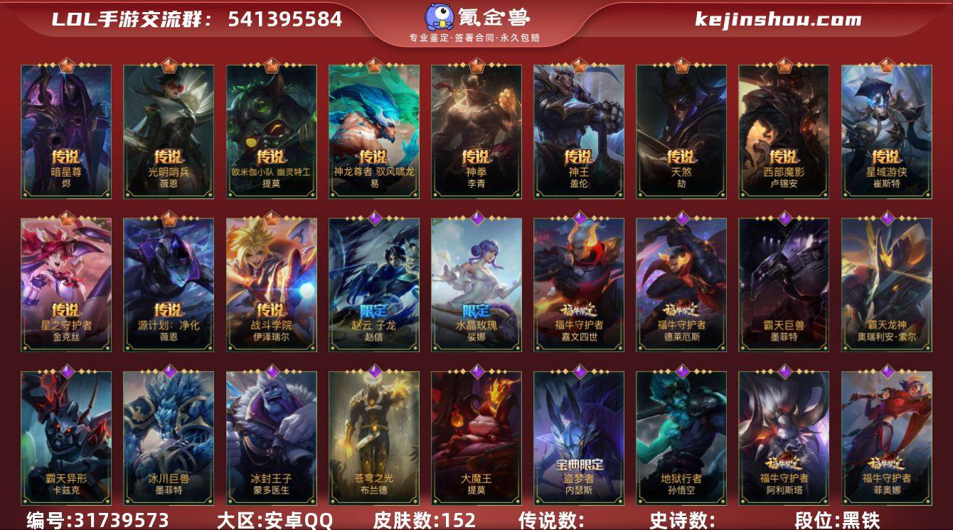 【编号33709】【店长推荐捡漏号】107英雄-152皮肤 【限定皮肤】:赵云 子龙 赵信,水晶玫瑰 娑娜 【传说皮肤】:神王 盖伦,源计划:净化 薇恩,光明哨兵 薇恩,星之守护者 金克丝,暗星尊 烬,星域游侠 崔斯特,天煞 劫,西部魔影 卢锡安,欧米伽小队 幽灵特工 提莫,神拳 李青,神龙尊者 驭风啸龙 易,战斗学院 伊泽瑞尔 【史诗皮肤】:腥红之月 亚托克斯,星域先知 卡尔玛,地狱行者 孙悟空,探梦奇旅 艾克,泳池派对 奥莉安娜,赵云 子龙 赵信,猎龙勇士 赵信,霸天异形 卡兹克,末路管家 布隆,灭迹行者 烬,霸天龙神 奥瑞利安·索尔,K/DA ALL OUT 卡莎,神龙尊者 玉境灵龙 卡莎,K/DA ALL OUT 伊芙琳,泳池派对 菲奥娜,福牛守护者 菲奥娜,福牛守护者 安妮,战场之王 亚索,幻梦甜心 阿狸,灵能特工 劫,欧米伽小队 魔鬼伞兵 崔丝塔娜,小恶魔 崔丝塔娜,娜就去看看 崔丝塔娜,大魔王 提莫,小蜜蜂 提莫,水晶玫瑰 娑娜,泳池派对 璐璐,星之守护者 璐璐,燎原烈焰 蔚,星域审判官 卡蜜尔,福牛守护者 嘉文四世,冰封王子 蒙多医生,盗梦者 内瑟斯,破败军团 厄运小姐,西部魔影 德莱厄斯,福牛守护者 德莱厄斯,战斗教授 格雷福斯,破败军团 德莱文,福牛守护者 阿利斯塔,霸天巨兽 墨菲特,冰川巨兽 墨菲特,绒毛 菲兹,战场之王 吉格斯,玉剑传说 武剑仙 锐雯,光明哨兵 锐雯,暗星 韦鲁斯,玉剑传说 舞剑仙 艾瑞莉娅,死亡誓约 卡特琳娜,神奇先驱 杰斯,灵能特工 莎弥拉,猎龙勇士 奥拉夫,苍穹之光 布兰德,灵魂烈焰 布兰德,泳池派对 雷克顿,西部魔影 锤石,盗梦暗影 锤石,古神 沃里克 【赛季皮肤】:s1光耀之刃,s2光耀之芒,s3光耀之灵,s4光耀之心,s5绯金魅影,s6绯金丽刃,s7绯金战斧,s8绯金鮫灵,s9王牌舰长,s10王牌上将,S11王牌勇将,s11王牌司令 【其他皮肤】:暗黑武士 雷恩加尔,脏...