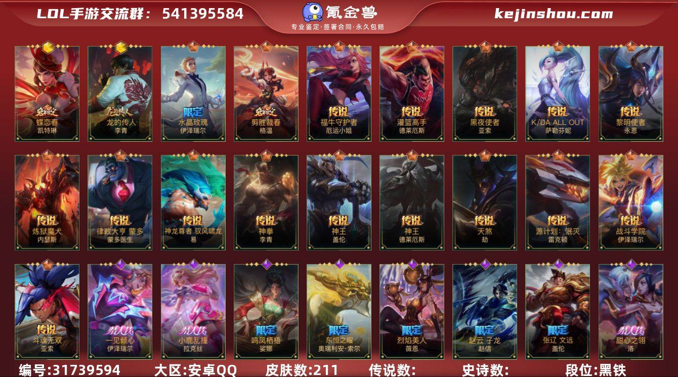 【编号29151】【店长推荐捡漏号】113英雄-211皮肤 【神话皮肤】:龙的传人 李青,蝶恋春 凯特琳 【限定皮肤】:龙的传人 李青,赵云 子龙 赵信,烈焰美人 薇恩,神龙烈焰 金克丝,虎痴之拳 蔚,闭月之颜 貂蝉 卡特琳娜,张辽 文远 盖伦,水晶玫瑰 嘉文四世,美猴王 孙悟空,水晶玫瑰 伊泽瑞尔,关羽 云长 泰达米尔,吕布 奉先 嘉文四世 【传说皮肤】:神王 盖伦,K/DA ALL OUT 萨勒芬妮,黑夜使者 亚索,斗魂无双 亚索,天煞 劫,剪胜裁春 格温,神拳 李青,律政大亨 蒙多医生,炼狱魔犬 内瑟斯,福牛守护者 厄运小姐,黎明使者 永恩,神龙尊者 驭风啸龙 易,灌篮高手 德莱厄斯,神王 德莱厄斯,水晶玫瑰 伊泽瑞尔,战斗学院 伊泽瑞尔,源计划:泯灭 雷克顿 【史诗皮肤】:钢铁军团 盖伦,张辽 文远 盖伦,战斗学院 拉克丝,小鹿乱撞 拉克丝,惊悚派对 阿木木,地狱火 阿木木,雷喵喵尔 雷恩加尔,黎明使者 卡尔玛,星域先知 卡尔玛,丧尸 努努和威朗普,美猴王 孙悟空,地狱行者 孙悟空,烈焰美人 薇恩,暗星 奥莉安娜,腥红之月 黛安娜,焕影迎春 佐伊,恶魔之刃 泰达米尔,腥红之月 泰达米尔,赵云 子龙 赵信,斗魂无双 赵信,暗星 卡兹克,神龙烈焰 金克丝,末路管家 布隆,西部牛仔 烬,腥红之月 烬,霸天龙神 奥瑞利安·索尔,东恒之曜 奥瑞利安·索尔,弹幕天使 卡莎,猎龙勇士 潘森,源计划:暗影 阿卡丽,源计划:火 菲奥娜,泳池派对 菲奥娜,福牛守护者 菲奥娜,战场之王 布里茨,悦鼓春生 萨勒芬妮,福牛守护者 安妮,源计划:风 亚索,战场之王 亚索,灵魂莲华 亚索,K/DA ALL OUT 阿狸,源计划:阴 劫,灵能特工 凯尔,未来战士 卢锡安,大魔王 提莫,鸣凤栖梧 娑娜,泳池派对 璐璐,寒冬精灵 璐璐,破败军团 希瓦娜,虎痴之拳 蔚,炼狱魔女 蔚,燎原烈焰 蔚,甜心之翎 洛,裂帛剪春 卡蜜尔,吕布 奉...