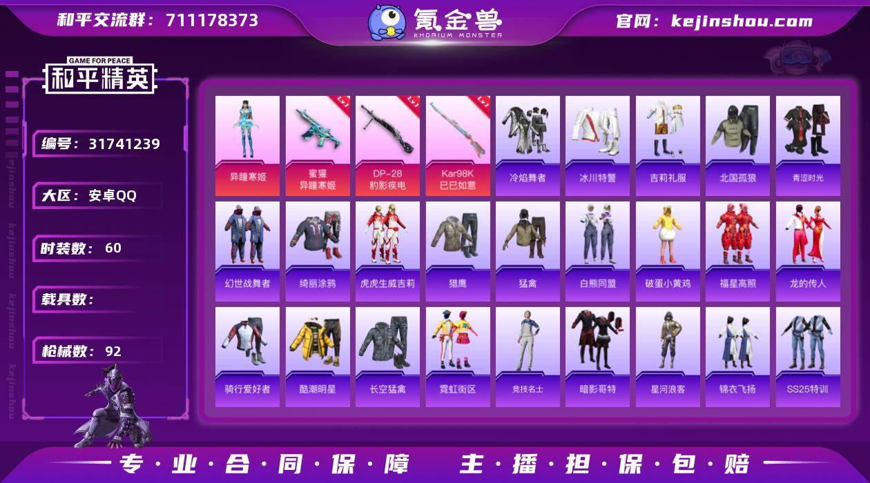 【1粉装7特效枪可秒换绑】 安卓Q区-29104热力值-3印记-60套装-92枪皮 【1稀有】 星河浪客【1粉装】角色-罪夜之冕 角色-异瞳寒姬【4特效枪】 Famas-天象三御(5级) Kar98K-巳巳如意(5级) DP-28-豹影疾电(5级) 蜜獾-异瞳寒姬(3级)【13热门】 GROZA-异彩先驱 长空猛禽 霓虹街区 破蛋小黄鸡 暗影哥特(红眼罩) SS26特训 SS25特训 M762-天降萌叽 UMP45-蓝色火焰 M249-彩虹符号 MG3-幻世战舞者 AKM-星之彼岸【2飞行器】 粉色滑翔尾迹 炫彩糖果飞行器 营地ID:786219009