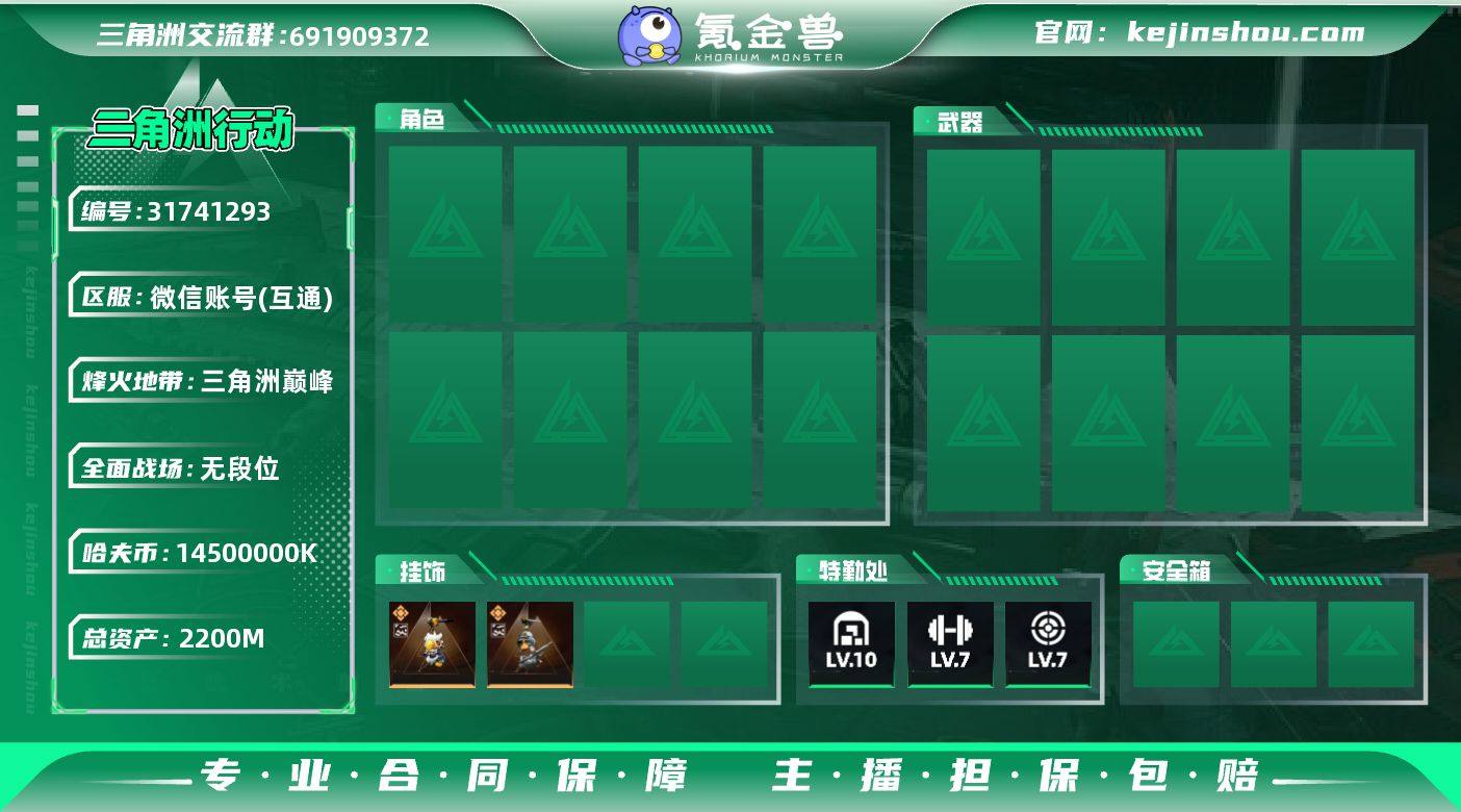 实名:可二次实名 总资产:2200M 哈夫币:14500000K 烽火地带段位:三角洲巅峰 烽火地带等级:30 全面战场段位:无段位 全面战场等级:0 10级仓库,7级训练中心,7级靶场,3级潜水中心,1级收藏室 战术部门等级:4 战斗部门等级:4 医疗部门等级:4 研发部门等级:4 后勤部门等级:4