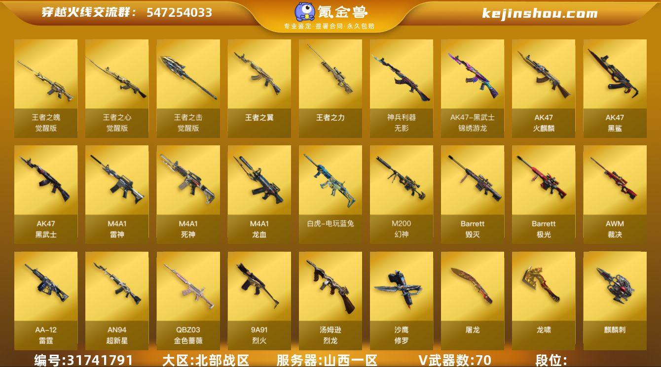北部战区(山西一区)ys【爆破号】【一万一千点券】70v【M200-幻神套装+皮/动感闪耀,竞技荣光套装,动感闪耀套装,QBZ03-金色蔷薇,白虎-电玩蓝兔,AWM-裁决,5修罗,USP-雷暴,柯尔特-竞技荣光,斯泰尔-蝴蝶,金刚伞-电玩红兔,猫猫手套】6王者【王者之心,王者之翼,王者之魄,王者之力,王者之击】1炫金【炫金骑士】9角色【四防电竞教官-云悠悠,王者涂鸦,魅影,王者-救世主,乔伊教练,奇洋探员,云海玲珑,雪域灵狐,零-纪元】2音效【M200-幻神音效卡,M4A1-雷神音效卡】17皮【幻神-动感闪耀,雷神-荣耀之魄,火麒麟-百城,毁灭-风暴,火麒麟-心动糖果,雷神-维纳斯,雷神-虎将,火麒麟-CFSTAR】截图展示段位不代表实际段位 如赛季更新等不可抗拒因素发生变化、时限道具不保证所剩时间
