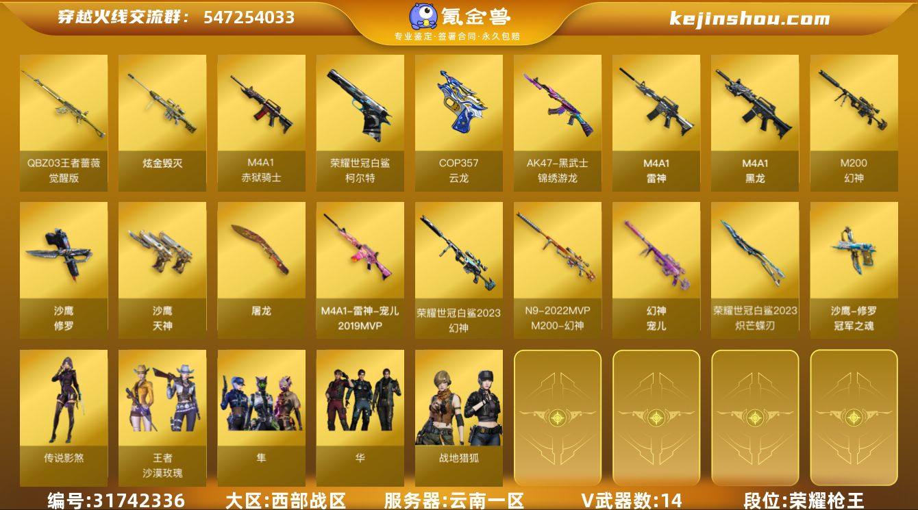 【CFX918】14V/100级/元帅/6王者/1炫金/3英雄/传说星骇/传说影煞/M200-幻神/柯尔特-荣耀世冠白鲨2023/沙鹰-修罗/炽芒蝶刃- 荣耀世冠白鲨2023/王者凌虎/炫金毁灭/幻神-宠儿/M200-幻神-N9-2022MVP/幻神-荣耀世冠白鲨 2023/雷神-宠儿-2019MVP/修罗-冠军之魂/隼/华/战地猎狐/王者-沙漠玫瑰/暗夜-X/嘉年华灵狐/曼陀罗-X/潘多拉-X/AWM-灵狐-15周年嘉年华/M4A1-黑龙/M4A1-雷神/AK47-黑武士-锦绣游龙/QBZ-03-王者蔷薇-觉醒版/沙鹰-天神/COP357-云龙/屠龙/丛林匕首-玄豹/王者冰锋-觉醒版/高爆手雷-云龙/闪光弹-玄豹/闪光弹-雷霆王者-觉醒版/M4A1-赤狱骑士/女皇终结者-魔龙之吻/绿色巨人/灵魂忍者/迷雾幽灵/夺命之镰/防化服/金色流光-枪王排位/星辰流光-枪王排位/巅峰赛先锋-金色流光/枪王排位28赛季金色流光/枪王排位29赛季金色流光/C4-红龙/防弹头盔/防弹衣/C4工具钳/手雷包