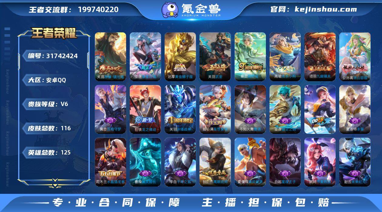 贵族等级:V6 典藏皮肤数:0 珍品无双皮肤数:0 无双皮肤数:0 珍品传说皮肤数:0 传说皮肤数:5 史诗皮肤数:40 皮肤数:116 英雄数:125 段位:荣耀王者 卖家说:急出个人一手号,可二次实名,安全无找回! - 段位:王者90星 - 巅峰赛:1792分 - 对抗路:67段 - 历史小国标:关羽(热门英雄,实力硬通货) 历史金标:亚连 姬小满 夏洛特 达摩 - 贵族等级:V6 - 皮肤数量:116款(多传说、多限定) - 账号状态:无封禁、无违规,信誉良好