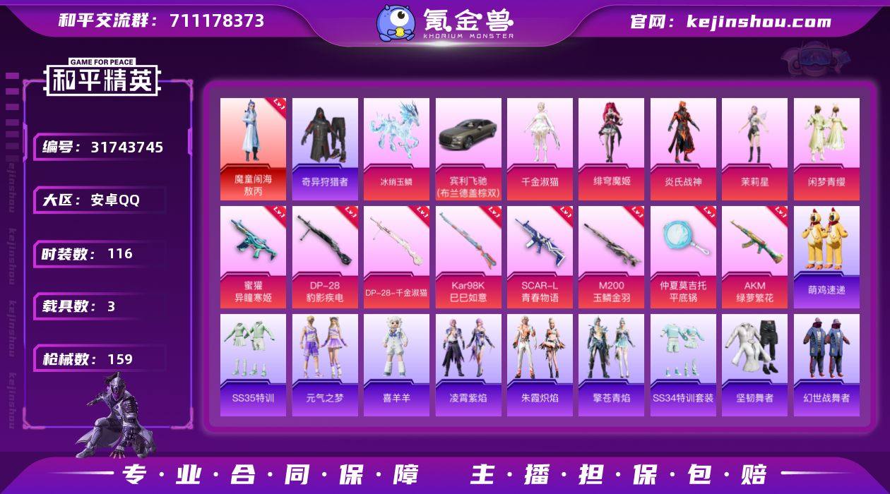 【ky619】安卓 手Q-11粉装-9特效枪-1载具-7粉色飞行器-59672热力值-5王牌印记-157套装-187枪皮 【热门品类】:套装-浪漫天命,套装-赤蝎幽灵,套装-都市猎人,套装-暗影哥特,角色-Mark.06 【粉色套装】:角色-绝对恒星,粉装-极限特训,粉装-幻影战神,粉装-甜心巧克力,粉装-宝贝奶油派,粉装-天使彩虹糖,粉装-千面幻镜,角色-脆鲨七海,粉装-星穹咏叹调,角色-罗征,角色-辉云木星 【粉色枪皮等级】:GROZA-镜光银凌(五级),AUG-暖羊咩咩(五级),AKS-74U-森灵之息(五级),Kar98K-巳巳如意(五级),Mk14-甜梦熊击(五级),Mk14-福马献瑞(四级),DP-28-豹影疾电(五级),MG-36-沧焰双生(五级),燃烧瓶-薄荷可可(五级) 【粉色载具】:冰绡玉鳞 【粉色枪皮】:GROZA-镜光银凌,AUG-暖羊咩咩,AKS-74U-森灵之息,Kar98K-巳巳如意,Mk14-甜梦熊击,Mk14-福马献瑞,DP-28-豹影疾电,MG-36-沧焰双生,燃烧瓶-薄荷可可 【粉色飞行器】:炫彩糖果飞行器,镜光幻境飞行翼,星月云朵飞行器,雀灵庇佑飞行器,飞天猪飞行器,暮色之舞飞行器,天空之门飞行器 【粉色降落伞】:绝对恒星降落伞,幻影战神降落伞,甜心宝贝降落伞,千面幻镜降落伞,第五大道降落伞,仲夏莫吉托降落伞,繁龙极客降落伞,精灵梦叶罗丽降落伞,鬼刀降落伞,戏水时光降落伞,星月云朵降落伞,雪月幻音降落伞,辉羽雀灵降落伞,幻彩电音降落伞,喜羊羊与灰太狼降落伞,异瞳寒姬降落伞,炫彩糖果降落伞,罪夜之冕降落伞 【稀有套装】:套装-巳巳如意,套装-小鸟芋圆,套装-雪国风尚,套装-炫彩糖果,套装-马上有钱,角色-达芬奇,角色-都市丽猫,套装-燕燕于飞,套装-鱼渊荷华,套装-雪夜云雾,套装-晨曦轻云,套装-樱梦幻音,套装-粉恋花,套装-紫幽梦,套装-蓝冰羽,套装-星影赞美诗,套装-星渊小夜曲,套装-极速光影,套装-彩虹兔,套装-云朵鹅,套装-...