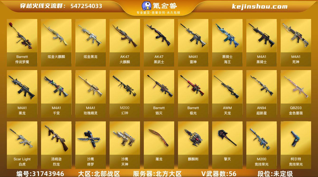 北方大区-58V-9王者-2炫金 【传说武器】:传说梦魇 【热门武器】:传说梦魇,QBZ03-金色蔷薇,Scar Light-白虎,M200-幻神,M200-竞技荣光,死亡之眼,M4A1-黑骑士*6,汤姆逊-烈龙*6,USP-雷暴,沙鹰-修罗*5 【王者炫金武器】:炫金火麒麟,炫金黑龙 【音效卡】:M4A1-黑骑士音效卡,Barrett-毁灭音效卡,Scar Light-白虎音效卡 【稀有皮肤】:雷神-传奇N9,雷神-赛博朋克,黑骑士-摸金校尉,M200-庆典-CFS 2021*3,AWM-CFS 2020 【角色】:王者-零,王者涂鸦,电竞教官-云悠悠,樱,铁骑荣耀,职业选手 【人偶武器】:迷你艾比,迷你裂空之翼*2,迷你牛牛,深渊终结者手雷 【暴走生化】:死亡之眼 【挑战大师】:机甲撕裂者III,神圣爆裂者-末日III,阐释者III*3,激光毁灭者III,VEPR-12-金魔 【英雄级武器】:M200-竞技荣光,柯尔特-竞技荣光*2,擎天-竞技荣光*3,USP-雷暴,QBZ03-金色蔷薇,Scar Light-白虎,M4A1-雷神*3,M4A1-黑龙,M4A1-玫瑰精灵,M4A1-黑骑士*6,M4A1-死神,汤姆逊-烈龙*6,AK47-火麒麟,AK47-黑武士,AN94-超新星,AWM-天龙*2,Barrett-毁灭,Barrett-极光,M200-幻神,M4A1-千变*3,黑骑士-海王,AK47-B-战神,沙鹰-天神,沙鹰-修罗*5,麒麟刺,擎天*2,屠龙*3 【特殊枪械】:1白虎,6黑骑士,6烈龙,0盘龙,0炼狱,0蝴蝶斯泰尔