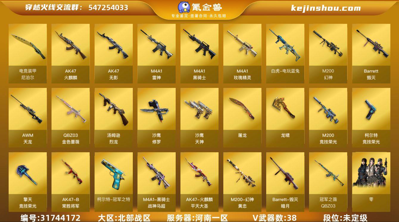 【精品账号/冠军之薇冠军之刃冠军之特之魄❤黄忠幻神王者星神鹰蔷薇白虎电玩❤幻神竞技套云悠悠❤生化鹰6烈龙小钢蝴蝶】河南一区-41V-1王者-0炫金 【热门武器】:QBZ03-金色蔷薇,M200-幻神,M200-竞技荣光,白虎-电玩蓝兔,柯尔特-冠军之特,炼狱-迷你小钢,M4A1-黑骑士,汤姆逊-烈龙*6,斯泰尔-蝴蝶,沙鹰-修罗,Knife-冠军之刃 【音效卡】:M4A1-黑骑士音效卡,QBZ03-金色蔷薇音效卡 【稀有皮肤】:M200-幻神-黄忠皮肤,QBZ03-冠军之薇,雷神-冠军之魄,火麒麟-平天大圣,黑骑士-战神马超,毁灭-暗月,M200-庆典-CFS 2021 【角色】:零-水下丽影,零,鹰,铁骑荣耀,职业选手,战地猎狐 【人偶武器】:斯泰尔-蝴蝶,AWM-灵狐-15周年嘉年华,炼狱-迷你小钢,迷你深渊冰龙,迷你艾比,迷你超能女侍,迷你裂空之翼,黄金迷你裂空之翼,迷你波特博士*2,夺魂*2,迷你牛牛*2,深渊终结者手雷*2 【暴走生化】:斯泰尔-蝴蝶,炼狱-迷你小钢,超级对讲机 【挑战大师】:KAC-圣炎切割者III,试炼破坏者III,激光毁灭者III,激光毁灭者III-白马银枪*2,AK47-冰龙粉碎者,冰龙粉碎者-白马银枪*2 【英雄级武器】:M200-竞技荣光,柯尔特-竞技荣光,擎天-竞技荣光,高爆手雷-竞技荣光,烟雾弹-竞技荣光*3,闪光弹-竞技荣光*2,尼泊尔-电竞装甲,QBZ03-金色蔷薇,白虎-电玩蓝兔,M4A1-雷神,M4A1-玫瑰精灵,M4A1-黑骑士,汤姆逊-烈龙*6,AK47-无影,AK47-火麒麟,AWM-天龙,Barrett-毁灭,M200-幻神,AK47-B-常胜将军,柯尔特-冠军之特,沙鹰-天神,沙鹰-修罗,龙啸,屠龙 【特殊枪械】:蝴蝶斯泰尔+6烈龙,0白虎,1黑骑士,6烈龙,0盘龙,0炼狱,1蝴蝶斯泰尔