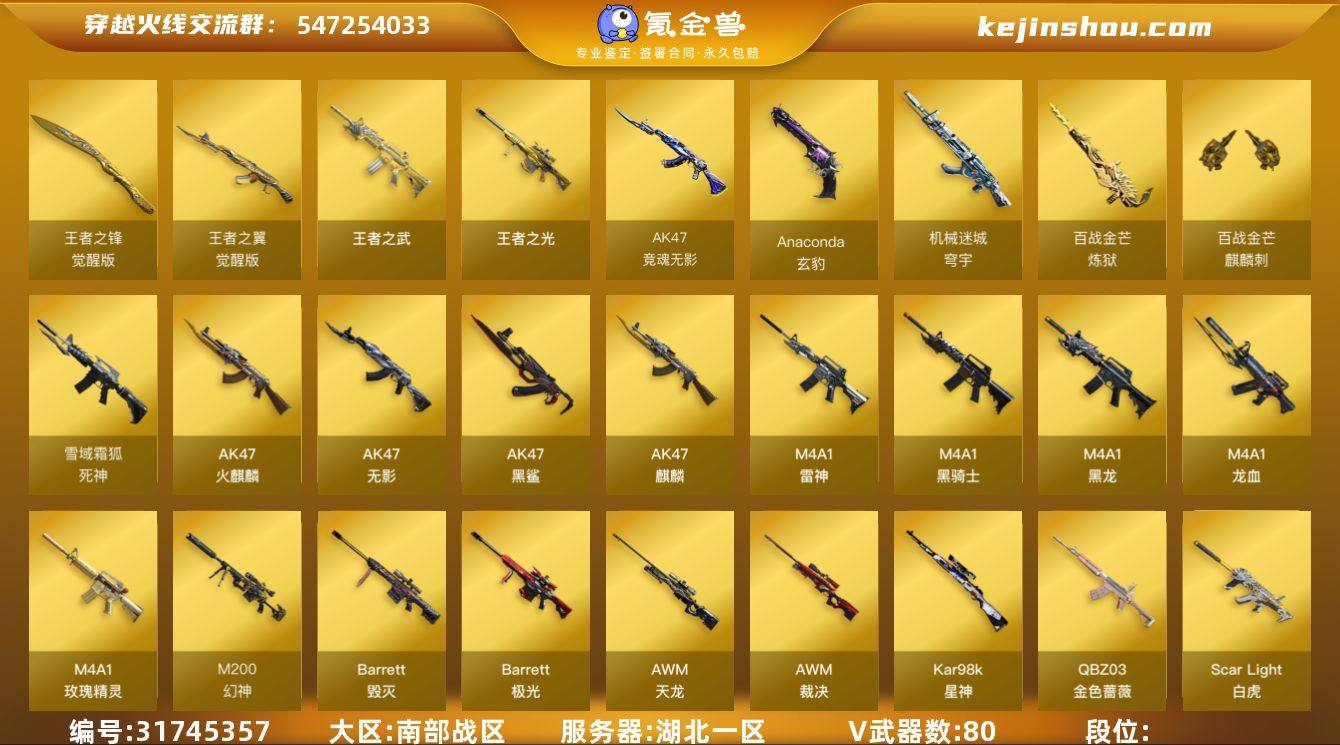 南部战区(湖北一区)ys【质量生化爆破号】80v【M200-幻神+皮/星耀,Kar98k-星神套装+皮/璀璨,ScarLight-白虎,QBZ03-金色蔷薇,AWM-裁决套+双皮(羽擎+运输船),6盘龙+6烈龙+6修罗,Anaconda-玄豹,Colt1911-大黄蜂】4王者【王者之翼,王者之武,王者之光,王者之锋】9角色【审判者,樱,魅影,零·纪元,战地猎狐,葵-阿尔法武装,奇洋探员,王者之瞳,雪域霜狐】10音效【Kar98k星神音效卡,雷神音效卡,毁灭音效卡,裁决音效卡,火麒麟音效卡,AWM-昌龙-怀旧音效卡,碧霄极光音效卡,炼狱-百战金芒-庆典舞曲音效卡,死神-雪域霜狐-怀旧音效卡】25皮【幻神-星耀,星神-璀璨,裁决-羽擎,裁决-运输船,雷神-R.LGD-CFPLS18冠军,毁灭-星空,雷神-星空,毁灭-SV-CFPLS16冠军,屠龙-惊鸿,毁灭-CFS2018,屠龙-春桃】VIP6截图展示段位不代表实际段位 如赛季更新等不可抗拒因素发生变化、时限道具不保证所剩时间