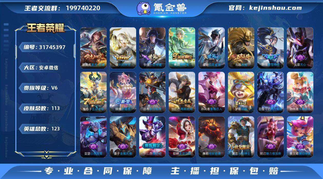 V6 6传说 113皮肤 123英雄 【6传说】镜-炽阳神光,李信-一念神魔,裴擒虎-寅虎·赤拳,虞姬-云霓雀翎,桑启-鸣野蒿【21史诗】元歌-无心,鬼谷子-五谷丰年,百里守约-特工魅影,蔡文姬-舞动绿茵,嫦娥-拒霜思,妲己-魅力维加斯,狄仁杰-魔术师,狄仁杰-鹰眼统帅,貂蝉-圣诞恋歌,韩信-傲雪梅枪,黄忠-火炮绅士,廉颇-地狱岩魂,吕布-末日机甲,马超-神威,墨子-金属风暴,孙尚香-水果甜心,孙尚香-蔷薇恋人,王昭君-偶像歌手,亚瑟-心灵战警,赵云-皇家上将,梦奇-顽趣