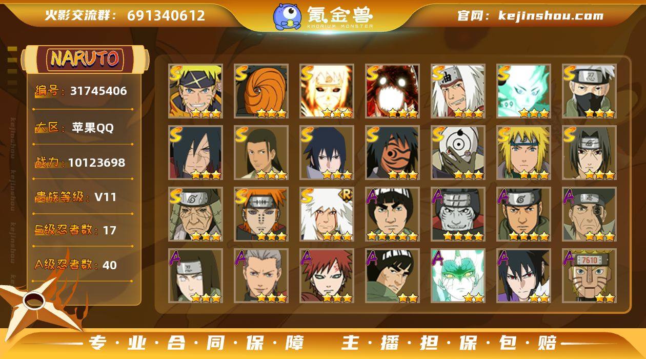 实名:不可二次实名 贵族等级:V11 战力值:10123698 S忍数:17 A忍数:40 三星漩涡鸣人·宇智波佐助,三星宇智波斑「五影会谈」,三星波风水门「九喇嘛连结」,三星漩涡鸣人「暴怒·第六尾」,三星自来也「传说中的三忍」,三星大筒木舍人「最终章」,三星旗木卡卡西「须佐能乎」,三星宇智波斑「秽土转生·解」,三星千手柱间·木叶创立,三星宇智波佐助「永恒万花筒」,三星神秘面具男「红夜之刃」,三星宇智波斑「白面具」,三星波风水门,三星宇智波鼬「须佐能乎」,三星猿飞日斩「秽土转生」,三星佩恩「天道」,三星自来也「舞之豪杰」 五星迈特凯,四星干柿鬼鲛,四星猿飞阿斯玛,三星土台「忍界大战」,三星日向宁次·忍界大战,三星飞段,三星我爱罗「疾风传」,二星迈特凯「青春爆炸」,二星巳月「仙人模式」,二星宇智波佐助「侠隐江湖」,二星机械鸣人「初始形态」,二星桃地再不斩「秽土转生」,二星神农「羁绊」,二星宇智波带土「漂泊浪客」,二星宇智波泉奈,二星蝎「绯流琥」,二星黑绝,二星角都「秽土转生」,二星李洛克「忍界大战」,二星旗木卡卡西「幻之真容」,二星漩涡博人「桃式显现」,二星小南「漂泊浪客」,二星我爱罗「新春限定」,二星长门「青年」,二星波风水门「青年」,二星千手扉间「漂泊武士」,二星宇智波佐助「须佐能乎」,二星桃地再不斩「漂泊武士」,二星小南「新春限定」,二星宇智波带土「暴怒」,二星千代「近松十人卫」,二星宇智波鼬「新春限定」,二星小南「夏日泳装」,二星秋道丁次「忍界大战」,二星波风水门「新春限定」,二星宇智波佐助「万花筒写轮眼」,二星旗木卡卡西「万花筒写轮眼」,二星飞段「死司凭血」,二星蝎,二星卑留呼「火之意志继承者」 卖家说:可砍价
