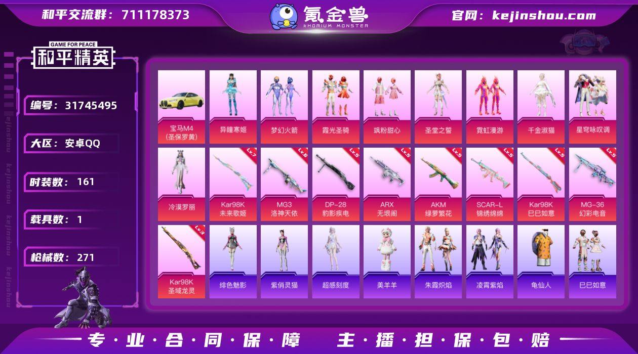 安卓 【公主号 梦幻火箭/飒粉甜心/AKM-绿萝繁花(五级)/宝马M4(圣保罗黄)】手Q-9粉装-9特效枪-1载具-8粉色飞行器-81725热力值-8王牌印记-161套装-271枪皮 【热门品类】:粉装-梦幻火箭,套装-龟仙人 【粉色套装】:粉装-梦幻火箭,粉装-霞光圣骑,粉装-飒粉甜心,角色-圣堂之誓,粉装-霓虹漫游,角色-千金淑猫,粉装-星穹咏叹调,角色-冷漠罗丽,角色-异瞳寒姬 【粉色枪皮等级】:AKM-绿萝繁花(五级),SCAR-L-锦绣绵绵(五级),ARX-无垠阁(五级),Kar98K-未来歌姬(七级),Kar98K-巳巳如意(五级),Kar98K-圣域龙灵(三级),DP-28-豹影疾电(五级),MG3-洛神天依(六级),MG-36-幻彩电音(五级) 【粉色载具】:宝马M4(圣保罗黄) 【粉色枪皮】:AKM-绿萝繁花,SCAR-L-锦绣绵绵,ARX-无垠阁,Kar98K-未来歌姬,Kar98K-巳巳如意,Kar98K-圣域龙灵,DP-28-豹影疾电,MG3-洛神天依,MG-36-幻彩电音 【粉色飞行器】:黄族统领飞行器,花傲天飞行器,繁龙极客飞行器,镜域双华-灵镜之阶,凤舞九天飞行器,月下星之子飞行器,圣域金龙飞行器 【粉色降落伞】:绝对恒星降落伞,梦幻火箭降落伞,齐天大圣降落伞,洛神天依降落伞,圣光天使降落伞,旋转彩虹降落伞,暗夜鎏金降落伞,仲夏莫吉托降落伞,梦幻舞会降落伞,变形金刚降落伞,闲梦青缨降落伞,炫光之旅降落伞,圣堂之誓降落伞,创世·救赎降落伞,脆鲨七海降落伞,盛世惊鸿降落伞,幻影飞狐降落伞,圣域龙灵降落伞,智耀战神降落伞,圣斗士星矢降落伞,星穹咏叹调降落伞,幻彩电音降落伞,绯穹魔姬降落伞,异瞳寒姬降落伞 【稀有套装】:套装-龟仙人,套装-巳巳如意,角色-超感刻度,套装-雏菊兔兔,套装-萝兰蝴蝶,角色-多纳泰罗,套装-糖糖葫芦,套装-青团波波,角色-摩登魅猫,角色-光矢逐梦,套装-燕燕于飞,套装-鱼渊荷华,角色-糖霜甜心,角色-蜜桃派对,套装-紫幽...