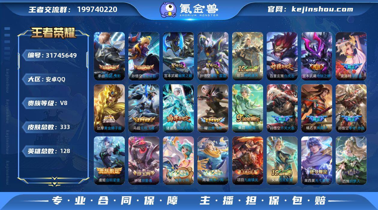 贵族等级:V8 典藏皮肤数:2 珍品无双皮肤数:0 无双皮肤数:0 珍品传说皮肤数:0 传说皮肤数:13 史诗皮肤数:106 皮肤数:333 英雄数:128 段位:绝世王者 卖家说:与无畏契约端游连体 皮肤:盖亚的复仇狂徒,般若假面幻影,混沌序曲狂徒,千灵华绽幻影,盖亚之愠,侦查力量蝴蝶刀,流星兵团短剑