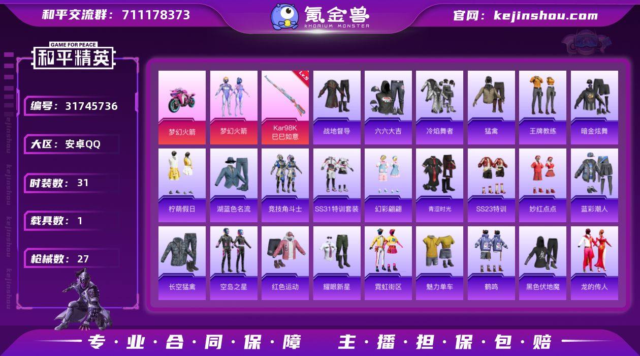 安卓 手Q-8粉装-5特效枪-0载具-2粉色飞行器-70029热力值-14王牌印记-175套装-229枪皮 【热门品类】:套装-胖达圆圆,套装-龟仙人 【粉色套装】:粉装-馨动时刻,角色-洛天依,角色-复仇流浪者,粉装-心之回忆,角色-圣堂之誓,套装-创世·救赎,角色-月下星之子,角色-樱桃泡泡 【粉色枪皮等级】:AKM-炫紫旋律(七级),SCAR-L-锦绣绵绵(五级),M762-电糖天使(七级),Kar98K-巳巳如意(五级),DP-28-豹影疾电(五级) 【粉色枪皮】:AKM-炫紫旋律,SCAR-L-锦绣绵绵,M762-电糖天使,Kar98K-巳巳如意,DP-28-豹影疾电 【粉色飞行器】:炫彩糖果飞行器,天之羽翼飞行器 【粉色降落伞】:绝对恒星降落伞,暗夜玫瑰降落伞,洛神天依降落伞,第五大道降落伞,炫光之旅降落伞,圣堂之誓降落伞,金丰海韵降落伞,千金淑猫降落伞,彩虹独角兽降落伞,喜羊羊与灰太狼降落伞,炫彩糖果降落伞,暮色玫影降落伞 【稀有套装】:套装-龟仙人,套装-巳巳如意,角色-甜心蒙太奇,套装-雪国风尚,套装-炫彩糖果,套装-雏菊兔兔,套装-萝兰蝴蝶,套装-糖糖葫芦,套装-青团波波,套装-棉花软糖,角色-都市丽猫,角色-摩登魅猫,套装-燕燕于飞,套装-鱼渊荷华,套装-粉恋花,套装-紫幽梦,套装-蓝冰羽,套装-星渊小夜曲,套装-彩虹兔,套装-云朵鹅,套装-雪绒豹,套装-朱霞炽焰,套装-凌霄紫焰,套装-擎苍青焰,玩偶服-美羊羊,玩偶服-喜羊羊,套装-画境星梦,套装-琴音绮想 【稀有枪皮】:AUG-冰晶雪宝,AKM-彩虹符号,AKM-破晓战魂,AKM-虎虎生威,AKM-霓虹街区,AKM-龙的传人,M16A4-幻世战舞者,M16A4-红色方程式,M16A4-蓝色火焰,M16A4-千金淑猫,SCAR-L-炫彩节奏,SCAR-L-玉兔迎春,SCAR-L-红色方程式,M416-糯团青竹,M416-红色方程式,M416-绯红前夜,M416-蓝色火焰,GROZA-懵萌河马,GROZA-田园牧歌,GROZA-黑色刀锋,AUG-耀粉歌...