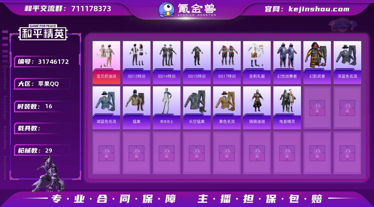 苹果【小号 粉装-宝贝奶油派/AKM-破晓战魂/M416-红色方程式/GROZA-彩虹符号/套装-SS13特训/套装-骁骑迪迦/AUG-天降萌叽】 手Q-1粉装-0特效枪-0载具-0粉色飞行器-8448热力值-2王牌印记-16套装-29枪皮 【粉色套装】:粉装-宝贝奶油派 【粉色降落伞】:古堡领主降落伞,银刃赛罗降落伞 【稀有枪皮】:AKM-破晓战魂,M416-红色方程式,GROZA-彩虹符号,AUG-天降萌叽,QBZ-赛罗,G36C-暗夜玫瑰,UZI-古堡领主,UMP45-生命誓言,Vector-夜灯,Vector-彩虹符号,Vector-生命誓言,汤姆逊-奇异狩猎者,汤姆逊-耀粉歌者,汤姆逊-银刃赛罗,Kar98K-彩虹符号,Kar98K-终极赛罗,M24-奇异狩猎者,Mini14-阿狸红 【其他套装】:套装-SS13特训,套装-SS14特训,套装-SS15特训,套装-SS17特训,套装-吉莉礼服,套装-幻世战舞者,套装-幻影武者,套装-深蓝色名流,套装-湖蓝色名流,套装-猛禽,套装-竞技名士,套装-长空猛禽,套装-黄色名流,套装-骁骑迪迦,套装-电音精灵 【营地ID】:723632609