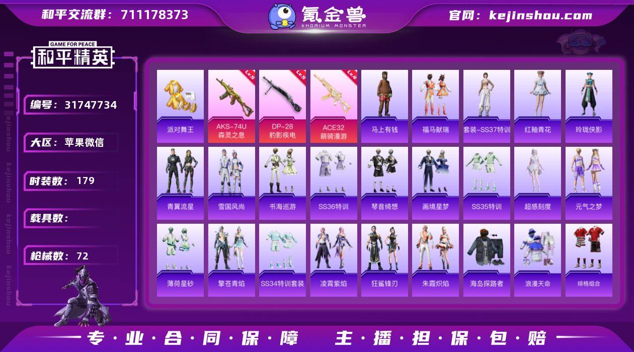 实名:可二次实名 是否支持人脸包赔:支持 特效枪数量:3 时装数:179 枪械数:72 派对舞王 五级AKS-74U-森灵之息,五级DP-28-豹影疾电,四级ACE32-萌骑漫游 狙击之神,马上有钱,福马献瑞,红釉青花,SS37特训,雨过天青,玲珑侠影,青翼流星,雪国风尚,画境星梦,琴音绮想,书海巡游,SS36特训,炫彩糖果,SS35特训,超感刻度,元气之梦,薄荷星砂,狂鲨锋刃,凌霄紫焰,擎苍青焰,SS34特训套装,朱霞炽焰,绯格组合,疯狂小兔子,贵族骑装,海岛探路者,湖蓝色名流,幻世战舞者,幻影公爵,街头潮人,金耀舞者,蓝调潮人,浪漫天命,漫步者,派对舞王,破蛋小黄鸡,青涩时光,热血青春,忍者信条,王牌教练,耀粉歌者 绝对恒星降落伞,极意拳锋降落伞,炫彩糖果降落伞,炫彩糖果飞行器,异瞳寒姬降落伞,喜羊羊与灰太狼降落伞,灵猫魔法师飞行器,终晖之翼飞行器,幻影战神降落伞,洛神天依降落伞,最终圣卫者降落伞