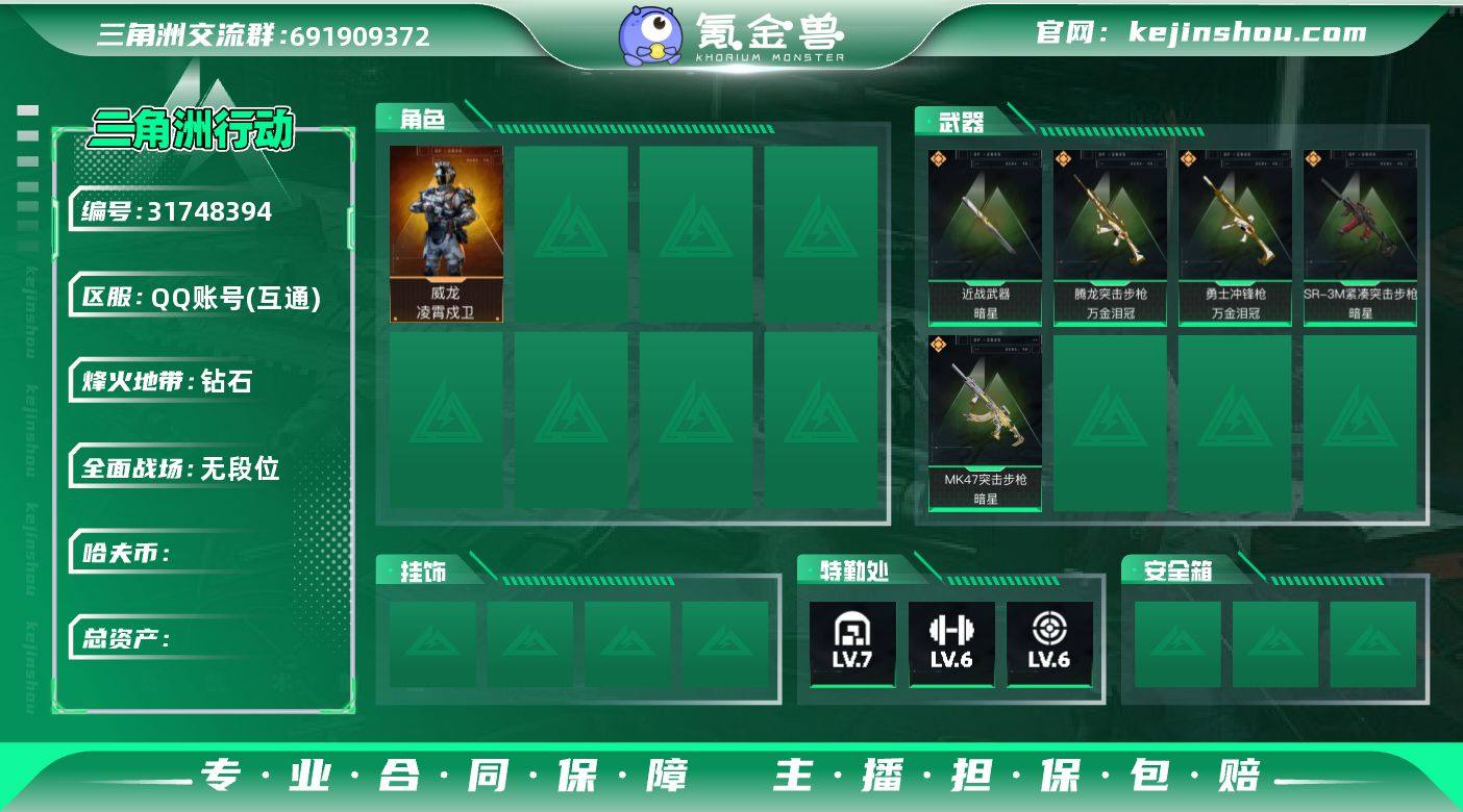 hf13831总资产50m纯币11m+凌霄戍卫全套+暗星全套+万金泪冠全套+s8赛季通行证+烽火等级60+特勤部门等级可以+永久包赔