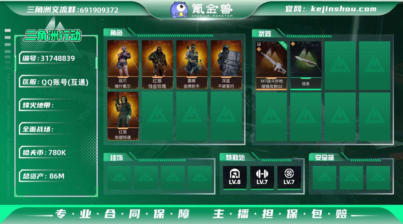 S1204 总资产86M,哈夫币78w,典藏1 近战2 枪皮数量162,骇爪-维什戴尔/红狼-蚀金玫瑰/露娜-金牌射手/红狼-电锯惊魂/深蓝-不破誓约,近战-信条,M7战斗步枪-棱镜攻势S2(优品S)战场等级20列兵, 行动等级60黑鹰,安全箱等时效性道具请以游戏内数据为准,详情请看图