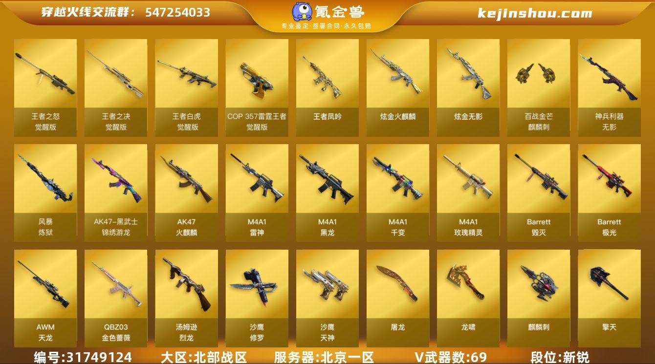 北京一区-74V-11王者-2炫金 【传说角色】:传说星骇 【热门武器】:QBZ03-金色蔷薇,M200-竞技荣光,死亡之眼,荣耀世冠-柯尔特,Cat-刀锋,汤姆逊-烈龙*4,USP-雷暴,沙鹰-修罗*3,荣耀世冠-龙啸 【王者炫金武器】:王者凤吟,炫金火麒麟,炫金无影 【音效卡】:Barrett-毁灭音效卡 【皮肤】:金色蔷薇-枪娘阿敏 皮肤,金色蔷薇-电竞之星 皮肤,星神-璀璨皮肤,雷神-荣耀之魄,雷神-荣耀世冠AG,雷神-源计划2.0专属 皮肤,火麒麟-荣耀世冠AG,火麒麟-百城,火麒麟-心动糖果,毁灭-荣耀之怒,毁灭-黑大圣皮肤,毁灭-风暴*2,毁灭-英雄计划 皮肤,M4A1-千变-孔明皮肤,无影-暗月,死神-机甲核心皮肤,天启-暗月*4,玫瑰精灵-粉色浪漫 皮肤,极光-能量核心,修罗-能量核心*2,屠龙-荣耀之锋,屠龙-春桃 皮肤*3,龙啸-醒狮 皮肤,轻型军用手斧-再燃火线,龙啸-青青莓果 皮肤,擎天-蒸汽钟表 皮肤,麒麟刺-萌杀皮肤 【角色】:零,葵,电竞教官-云悠悠,王者炫,乔伊教练,修道士,云海玲珑,暗夜-X,北极狐-X,风暴女,虎妞,嘉年华灵狐,娟娟,兰妹妹,灵狐-花神,灵狐者-七夕宝贝,龙儿,龙儿-小淘气,麻雀,曼陀罗-X,曼陀罗-礼服,玫瑰花神,萌儿,潘多拉-甜心教官,潜龙队-X,青霞仙子,斯沃特-X,铁骑荣耀,维纳斯,雪莉杨,雪莉杨-摸金校尉,夜玫瑰-幻能朋克,樱-战斗天使,影武者-X 【人偶武器】:迷你宝贝,加特林-机械猎手,AWM-灵狐-15周年嘉年华,M37-葵,Cat-刀锋,迷你深渊冰龙,迷你牛魔王,迷你波特博士,夺魂,迷你生化手雷*2,生化手雷-机甲核心,深渊终结者手雷,迷你艾比,迷你超能女侍,迷你巨石泰坦-魔花研究所,灵狐娃娃手雷 【暴走生化】:死亡之眼,超级对讲机 【挑战大师】:激光毁灭者III-白马银枪,机甲撕裂者III,试炼破坏者III,KAC-圣炎切割者III,神圣爆裂者-末日III,阐释者III 【...