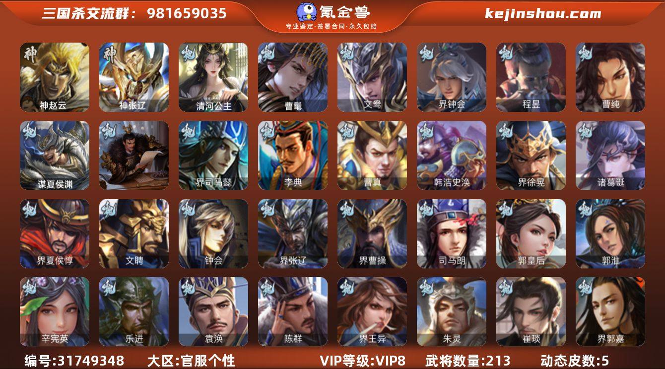 【14789190】官阶:领军将军;VIP等级:VIP8;史诗武将数量:11;动态皮肤数量:5;武将总数:213;史诗宝珠数量:43;将魂数量:3618;神将:2;魏国史诗武将:2;蜀国史诗武将:1;吴国史诗武将:3;群史诗武将:1
