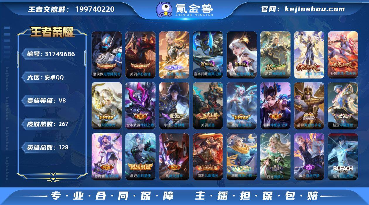 安卓Q-V7-尊贵铂金II段位-128英雄-361皮肤-4典藏皮肤-1典藏英雄-26传说-97史诗【英雄全皮】:刘邦全皮,李信全皮,夏洛特全皮,戈娅全皮,影全皮【荣耀典藏】:武则天英雄,孙悟空全息碎影,武则天倪克斯神谕,李白鸣剑曳影,铠银白咏叹调【传说皮肤】:后羿神树通天,西施续相思,澜愿照九州拓,桑启鸣野蒿,铠冥王哈迪斯,诸葛亮鹤羽星尊,夏洛特浮生妄,李信山海炽霜斩,李白诗剑行,百里守约碎云,后羿无尽星芒,露娜启示之音,孙策末日机甲,孙尚香异界灵契,赵云淬星耀世,西施游龙清影,诸葛亮时雨天司,铠绛天战甲,虞姬启明星使,孙悟空零号赤焰,曜云鹰飞将,李信一念神魔,刘备时之恋人,伽罗太华,后羿黄金射手座,貂蝉仲夏夜之梦【限定皮肤】:铠冥王哈迪斯,狄仁杰阴阳师,赵云皇家上将,赵云龙胆,赵云百木心枪,墨子神迹守卫,嬴政优雅恋人,孙尚香蔷薇恋人,孙尚香异界灵契,鲁班七号乒乒小将,庄周高山流水,阿轲迷踪丽影,钟无艳超时空战士,孙膑天狼运算者,扁鹊奇幻香踪,白起夜都怪侠,芈月重明,芈月幻夜卜梦,吕布御风骁将,元歌云间偶戏,元歌无心,夏侯惇朔风刀,甄姬落雪兰心,典韦岱宗,马可波罗暗影游猎,狄仁杰魔术师,狄仁杰万华元夜,达摩星际陆战队,达摩沙漠行僧,项羽海滩派对,老夫子醍醐杖,老夫子航海奇遇记,程咬金演武夺筹,露娜启示之音,刘邦夺宝奇兵,韩信傲雪梅枪,王昭君午后时光,兰陵王金庭之子,亚瑟潮玩骑士王,孙悟空零号赤焰,孙悟空孙行者,后羿圣弓游侠,后羿无尽星芒,李元芳云中旅人,虞姬启明星使,钟馗驱傩正仪,杨玉环遇见飞天,杨戬潮玩骑兵,干将莫邪真爱魔法,雅典娜单词大作战,蔡文姬繁星吟游,鬼谷子原初探秘者,鬼谷子五谷丰年,诸葛亮时雨天司,诸葛亮鹤羽星尊,黄忠火炮绅士,苏烈千军破阵,百里守约朱雀志,弈星混沌棋,沈梦溪大漠名商,明...