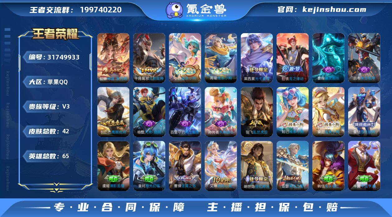 【1.13w/小国元流之子 万战省标张飞 v3 42皮 2传说】实名: 可修改 贵族等级: V3 英雄数: 65 皮肤数: 42 传说皮: 久胜战神,神骥·聚万邦