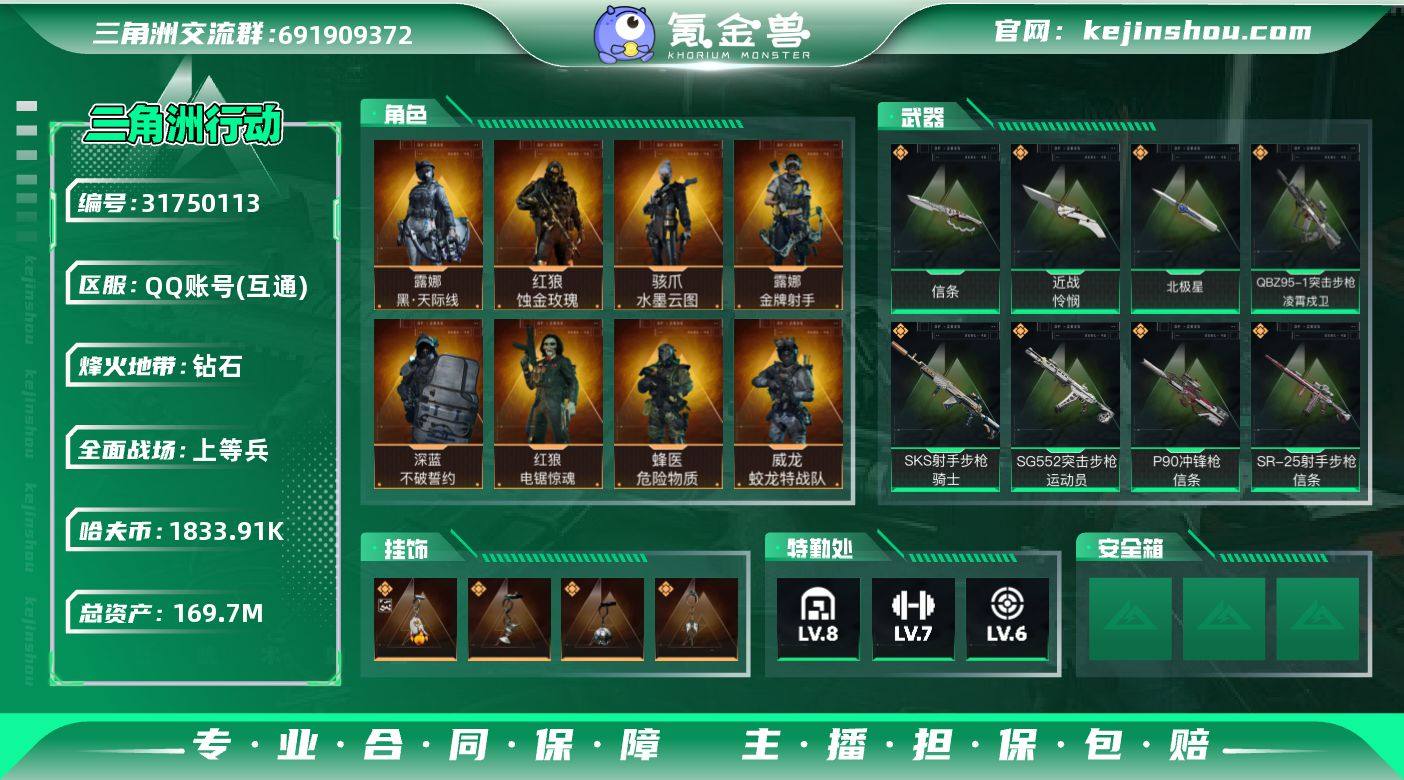 实名:不可二次实名 总资产:169.7M 哈夫币:1833.91K 烽火地带段位:钻石 烽火地带等级:60 全面战场段位:上等兵 全面战场等级:50 8级仓库,7级训练中心,6级靶场,5级指挥中心,3级潜水中心,3级防具台,3级工作台,3级制药台,3级技术中心,1级收藏室 战术部门等级:3 战斗部门等级:2 医疗部门等级:3 研发部门等级:2 后勤部门等级:2 曼德尔砖-气象感应:0 曼德尔砖-命运王牌:0 曼德尔砖-电玩高手:0 曼德尔砖-美杜莎:0