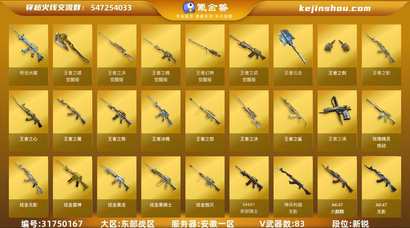 安徽一区-93V-17王者武器数-8炫金武器数 【传说武器】:传说光耀 【热门武器】:传说光耀,QBZ03-金色蔷薇,HK417-朱雀,M200-幻神,死亡之眼*2,白虎-电玩蓝兔,Kar98K-星神,M4A1-黑骑士,汤姆逊-烈龙*6,RPK-盘龙,加特林-炼狱*3,斯泰尔-蝴蝶,沙鹰-修罗*3 【王者炫金武器】:王者冰魄,王者之鲨,王者之翼,王者之势,玫瑰精灵-悦动,王者之影,王者之心,王者之决,王者之怒,王者之魂,王者之刺,王者云击,炫金骑士,炫金无影,炫金黑龙*2,炫金雷神,炫金毁灭*3 【音效卡】:AK47-火麒麟音效卡,M4A1-黑骑士音效卡,Barrett-毁灭音效卡 【皮肤】:雷神-星空,雷神-脉冲核心,火麒麟-轻羽皮肤,火麒麟-大唐荣光,火麒麟-心动糖果,毁灭-暗月,毁灭耀金皮肤,毁灭-星空,M4A1-千变-孔明皮肤*2,黑龙-暗月,黑骑士-暗月*2,黑骑士-冠军之势,无影-暗月,无影-能量核心,无影-霓裳皮肤,死神-秘银,天启-暗月*2,AK47-B-常胜将军-孙权,天龙-能量核心,极光-能量核心*2,修罗-能量核心,天神-暗月 【角色】:零,葵,樱,瞳,兰-巾帼英雄,王者-瞳-闭月羞花,王者-零,王者春,乔伊教练,暗夜-X,嘉年华灵狐,灵狐者-职业经理,斯沃特-X,影武者-X 【人偶武器】:迷你救赎猎手,斯泰尔-蝴蝶,AWM-灵狐-15周年嘉年华,迷你生化手雷,生化手雷-机甲核心,迷你超能女侍 【暴走生化】:死亡之眼*2,超级对讲机 【挑战大师】:激光毁灭者III-白马银枪,激光毁灭者III,神圣爆裂者-末日III 【英雄级武器】:M4A1-千变,AK47-火麒麟*3,AK47-麒麟,M4A1-黑龙*7,M4A1-雷神,M4A1-黑骑士,AK47-无影,M4A1-死神*2,M4A1-武圣,AK47-机械迷城*2,M4A1-龙血,HK417-朱雀,M4A1-神工天巧,无影-神兵利器,M4A1-玫瑰精灵*2,QBZ03-金色蔷薇,烈火-动感闪耀,王者之武-觉醒版,王者之魄-觉醒版,AK-47-猩红传说*2,黑骑士-...