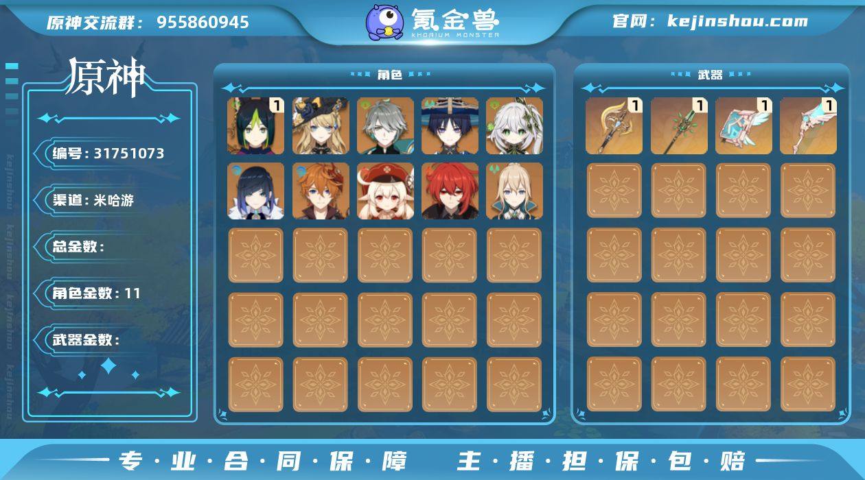 【金色角色】:娜维娅(0命),艾尔海森(0命),流浪者(0命),纳西妲(0命),提纳里(1命),夜兰(0命),达达利亚(0命),可莉(0命),琴(0命),迪卢克(0命) 【拥有武器】:裁断(精1),和璞鸢(精1),天空之卷(精1),天空之翼(精1) 【紫色角色】:琳妮特(2命),卡维(0命),米卡(满命),瑶瑶(0命),珐露珊(1命),莱依拉(2命),坎蒂丝(3命),多莉(1命),柯莱(3命),鹿野院平藏(1命),久岐忍(1命),云堇(3命),五郎(1命),托马(4命),九条裟罗(2命),早柚(1命),罗莎莉亚(0命),辛焱(1命),迪奥娜(2命),砂糖(4命),雷泽(2命),菲谢尔(2命),丽莎(1命),香菱(0命),安柏(1命),班尼特(4命),行秋(2命),芭芭拉(2命),凝光(3命),诺艾尔(3命),凯亚(1命),重云(1命)