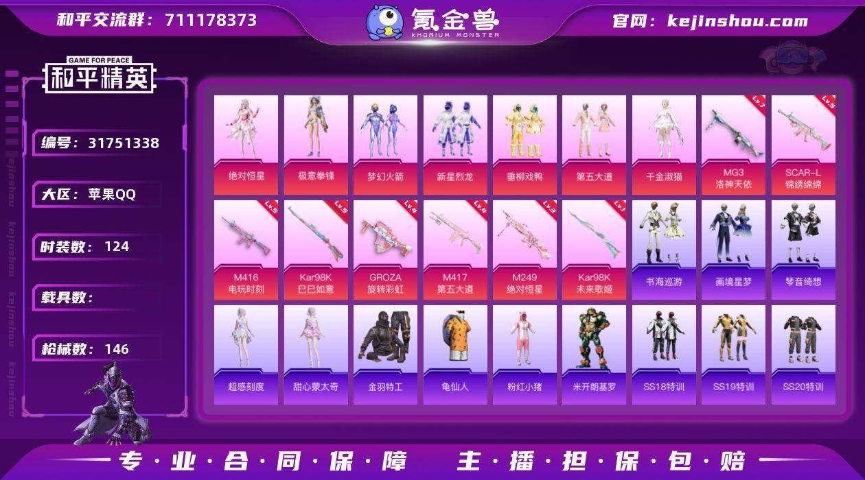 苹果 手Q-7粉装-10特效枪-0载具-1粉色飞行器-46131热力值-14王牌印记-124套装-146枪皮 【热门品类】:粉装-梦幻火箭,套装-金羽特工,套装-龟仙人,套装-粉红小猪 【粉色套装】:角色-绝对恒星,粉装-梦幻火箭,粉装-新星烈龙,粉装-垂柳戏鸭,粉装-第五大道,角色-千金淑猫,粉装-极意拳锋 【粉色枪皮等级】:SCAR-L-锦绣绵绵(五级),M416-电玩时刻(五级),GROZA-旋转彩虹(四级),AKS-74U-森灵之息(四级),Kar98K-未来歌姬(一级),Kar98K-巳巳如意(五级),M417-第五大道(四级),M249-绝对恒星(三级),MG3-洛神天依(七级) 【粉色枪皮】:SCAR-L-锦绣绵绵,M416-电玩时刻,GROZA-旋转彩虹,AKS-74U-森灵之息,Kar98K-未来歌姬,Kar98K-巳巳如意,Mk14-福马献瑞,M417-第五大道,M249-绝对恒星,MG3-洛神天依 【粉色飞行器】:绝对恒星飞行器 【粉色降落伞】:绝对恒星降落伞,梦幻火箭降落伞,洛神天依降落伞,第五大道降落伞,忍者神龟降落伞 【稀有套装】:套装-龟仙人,角色-超感刻度,角色-甜心蒙太奇,套装-雪国风尚,角色-米开朗基罗,套装-书海巡游,套装-画境星梦,套装-琴音绮想 【稀有枪皮】:AKM-夜灯,AKM-彩虹符号,AKM-灼热熔岩,AKM-破晓战魂,AKM-霓虹街区,AKM-龙的传人,M16A4-幻世战舞者,M16A4-红色方程式,SCAR-L-夜灯,SCAR-L-炫彩节奏,SCAR-L-玉兔迎春,SCAR-L-红色方程式,SCAR-L-黄金龙骨,M416-糯团青竹,M416-红色方程式,M416-蓝色火焰,GROZA-暮色玫影,AUG-天降萌叽,AUG-耀粉歌者,AUG-绝对恒星,QBZ-彩虹符号,QBZ-洛神天依,M762-天降萌叽,M762-彩虹符号,M762-第五大道,Mk47-洛神天依,G36C-星穹咏叹调,AC-VAL-天降萌叽,AC-VAL-快闪甜心,蜜獾-垂柳戏鸭,蜜獾-天降萌叽,蜜獾-娇憨猪猪,ACE32-画境星梦,UZI-啾咪啾咪,UZI-娇憨猪猪,UZI-炫彩节奏,UZI-红色方程式,UMP45-...