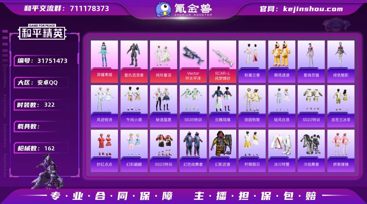 【4粉装-9特效枪-有地铁天赋】安卓手Q-4王牌印记-4粉装-9特效枪-42933热力值-86套装-162枪皮-2卓越印记 【4粉装】角色-复仇流浪者,角色-绝对恒星,角色-异瞳寒姬,套装-纯珍童话 【9特效枪】蜜獾-异瞳寒姬/5级,Vector-环太平洋/2级,ACE32-萌骑漫游/1级,MG-36-沧焰双生/5级,SCAR-L-纯梦嫁纱/5级,Mk14-福马献瑞/5级,PKM-萌骑夺宝/1级,AKS-74U-森灵之息/5级,M249-绝对恒星/5级 【1稀有紫装】龟仙人 【83稀有时装】异瞳寒姬,绝对恒星,SS35特训,午间小调,SS36特训,琴音绮想,画境星梦,狂鲨锋刃,阳光菠萝,龟仙人,紫俏灵猫,粉黛兰香,云魄琉璃,炫彩糖果,绯色魅影,萌鸡速递,书海巡游,风迹短诗,甜心蒙太奇,秘语星愿,超感刻度,雪国风尚,复仇流浪者,纯珍童话,街头风暴,元素星魂,华灯初上,英勇保护者,都市漫游者,龙的传人,军刀雅典娜,青翼流星,SS37特训,蓝色运动,白色伏地魔,黄色名流,绯格组合,SS26特训,空岛之星,黑色伏地魔,黎明保卫者,炫蓝之夏,竞技名士,长空猛禽,甜蜜告白,冷焰舞者,惊鸿侠骨,魅力单车,春光漫游,甜心亚梦,虚音幻奏,幻世战舞者,牛气满满,萌趣咩咩,娇憨猪猪,冰川特警,麻辣教官,幻影武者,疯狂小兔子,快闪甜心,蓝彩潮人,海岛探路者,霓虹街区,田园牧歌,轻风白浪,牛气冲天,飞行日记,空投萌叽,SS19特训,SS20特训,SS21特训,玉兔迎春,SS22特训,SS23特训,龙舌兰冰茶,神气柴柴,妙红点点,幻彩翩翩,柠萌假日,SS24特训,懵萌河马,SS25特训,锦衣飞扬 【155稀有枪械】MG-36-沧焰双生/5级,蜜獾-异瞳寒姬/5级,AKS-74U-森灵之息/5级,M249-绝对恒星/5级,SCAR-L-纯梦嫁纱/5级,Vector-环太平洋/2级,DBS-风迹短诗,莫辛纳甘-风迹短诗,Win94-乌木金纹,MK12-风迹短诗,MK12-乌木金纹,破片手榴弹-爆破雪人,ACE32-画境星梦,M1加兰德-画境星梦,MP5K-画境星梦,M762-登顶巅