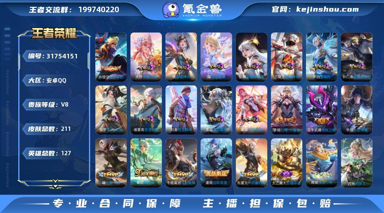 贵族等级:V8 典藏皮肤数:1 珍品无双皮肤数:0 无双皮肤数:0 珍品传说皮肤数:0 传说皮肤数:8 史诗皮肤数:49 皮肤数:211 英雄数:127 段位:无双王者 卖家说:这个账号再抽6次积分夺宝就可以抽出一颗荣耀水晶, 这个是一个V八账号。因为不想玩了,想退游了,所以便宜卖了,还有几个小标