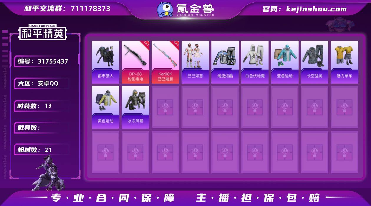 安卓 手Q-0粉装-2特效枪-0载具-1粉色飞行器-4894热力值-0王牌印记-13套装-21枪皮HZ26202108 【热门品类】:套装-都市猎人 【粉色枪皮等级】:Kar98K-巳巳如意(一级),DP-28-豹影疾电(一级) 【粉色枪皮】:Kar98K-巳巳如意,DP-28-豹影疾电 【粉色飞行器】:炫彩糖果飞行器 【粉色降落伞】:炫彩糖果降落伞 【稀有套装】:套装-巳巳如意 【稀有枪皮】:M16A4-幻世战舞者,AUG-幻影战神,UZI-天降萌叽,Vector-创世·救赎,M24-影袭,SKS-炫彩节奏,Mini14-耀粉歌者,MG3-幻世战舞者 【其他套装】:套装-潮流炫酷,套装-白色伏地魔,套装-蓝色运动,套装-长空猛禽,套装-魅力单车,套装-黄色运动,套装-冰冻风暴 【营地ID】:993096674