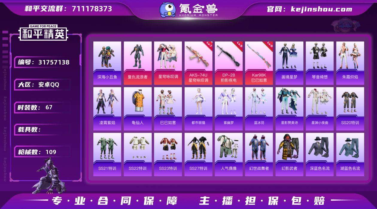 安卓 手Q-2粉装-6特效枪-0载具-0粉色飞行器-28461热力值-6王牌印记-67套装-109枪皮 【热门品类】:套装-深海小丑鱼,套装-龟仙人 【粉色套装】:角色-复仇流浪者,粉装-星穹咏叹调 【粉色枪皮等级】:AKS-74U-星穹咏叹调(七级),AKS-74U-森灵之息(五级),Kar98K-巳巳如意(五级),DP-28-豹影疾电(五级) 【粉色枪皮】:ACE32-萌骑漫游,AKS-74U-星穹咏叹调,AKS-74U-森灵之息,Kar98K-巳巳如意,Mk14-福马献瑞,DP-28-豹影疾电 【粉色降落伞】:星穹咏叹调降落伞,炫彩糖果降落伞 【稀有套装】:套装-龟仙人,套装-巳巳如意,角色-都市丽猫,套装-紫幽梦,套装-蓝冰羽,套装-星影赞美诗,套装-星渊小夜曲,套装-朱霞炽焰,套装-凌霄紫焰,套装-画境星梦,套装-琴音绮想,套装-雨过天青,套装-红釉青花 【稀有枪皮】:AKM-破晓战魂,M16A4-幻世战舞者,SCAR-L-玉兔迎春,M416-红色方程式,M416-蓝色火焰,AUG-天降萌叽,AUG-耀粉歌者,M762-天降萌叽,G36C-星穹咏叹调,AC-VAL-天降萌叽,蜜獾-天降萌叽,ACE32-画境星梦,ARX-凌霄紫焰,UZI-啾咪啾咪,UZI-天降萌叽,汤姆逊-幻星舰长,MP5K-画境星梦,JS9-凌霄紫焰,P90-巳巳如意,Kar98K-星穹咏叹调,M24-幻彩电音,VSS-彩虹符号,SLR-彩虹符号,AMR-喜羊羊与灰太狼,M1加兰德-画境星梦,S686-彩虹符号,S686-巳巳如意,S1897-炫彩节奏,S12K-玩趣呆呆,S12K-破晓战魂,S12K-幻世战舞者,DBS-彩虹符号,DBS-幻彩电音,AA12-G-画境星梦,M249-破晓战魂,M249-糯团青竹,DP-28-彩虹符号,MG3-幻世战舞者,MG-36-凌霄紫焰,P92-凌霄紫焰,短管霰弹-星穹咏叹调,蝎式手枪-千金淑猫,TMP-9-雪月幻音,爆炸猎弓-喜羊羊与灰太狼,平底锅-凌霄紫焰,平底锅-画境星梦,破片手榴弹-巳巳如意 【其他套装】:套装-SS20特训,套装-SS21特训,套装-SS22特训,套装-SS23特训,套装-S...