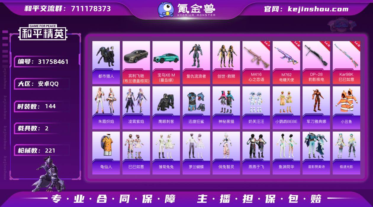 安卓手Q S-CWZ153【2粉装4特效枪2载具1粉色飞行器 复仇流浪者/创世救赎/军刀雅典娜/都市猎人/小丑鱼/龟仙人/俏兔智灵/冰川特警】62060热力值818扭蛋碎片14王牌印记144套装221枪皮 【热门品类】:角色-军刀雅典娜,套装-都市猎人,套装-小丑鱼,套装-龟仙人 【粉色套装】:角色-复仇流浪者,套装-创世·救赎 【粉色枪皮等级】:M416-心之恋语(七级),M762-电糖天使(六级),Kar98K-巳巳如意(五级),DP-28-豹影疾电(五级) 【粉色载具】:宾利飞驰(布罗德盖棕双色),