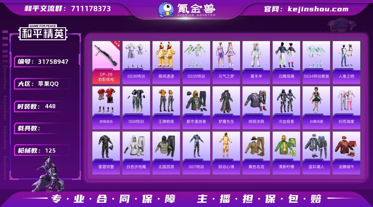 实名:可二次实名 是否支持人脸包赔:支持 特效枪数量:1 时装数:448 枪械数:125 五级DP-28-豹影疾电 SS36特训,炫彩糖果,萌鸡速递,SS35特训,元气之梦,喜羊羊,云魄琉璃,SS34特训套装,冰川特警,北国孤狼,滨海厨神,白糯汤圆,白色伏地魔,半糖蓝莓,初雨海棠,顶瓜瓜,都市魅力,都市漫游者,风暴特警,绯格组合,疯狂小兔子,风行保卫者,格斗先锋,湖蓝色名流,和平特警,黑色伏地魔,黄色伏地魔,黄色名流,黄色运动,红色运动,恒星战甲,黑夜传说,极地朋克,橘黑制服,竞技达人朋克,竞技名士,竞技勇士朋克,坚韧舞者,极速红龙,蓝彩潮人,凛冬战士,蓝色运动,龙腾端午,雷霆特警,冷血极客,冷焰舞者,魅力单车,迷域探索者,梦魇先生,霓虹街区,怒火燎原,牛气满满,派对绅士,破蛋小黄鸡,破晓战魂,绮丽涂鸦,奇趣章鱼,清新柠檬,千禧之恋,熔岩使者,人鱼之吻,圣诞大吉,深蓝冒险家,沙漠兵团,SS12特训,SS13特训,SS14特训,SS22特训,SS23特训,SS26特训,SS27特训,SS2特训,SS32特训套装,SS33特训套装,SS3特训,SS4特训,SS5特训,SS6特训,SS7特训,SS8特训,SS9特训,甜蜜菠萝,甜蜜告白,特殊使命,特训学院,特种空勤,特战装甲,王牌教练,午夜朋克,夏日音浪,雪山精英,雪山征服者,新侠客行,跃动心情,耀粉歌者,阳光火鸡,野性战魂,野性战心,夜莺强袭者,异域银装,战地督导,战地菁英,智慧之神,众神之王,灼焰舞者 极意拳锋降落伞,炫彩糖果降落伞,炫彩糖果飞行器,神秘黑猫飞行器,第五大道降落伞,金风玉露降落伞,PEL轰鸣竞梦者降落伞,深海曼妙降落伞 卖家说:极品ID: x少 加极品兵团:96 这赛季有手册有是王牌有都市猎人+浪漫天命+三个升级枪+90天特权卡 诚心的可以小刀 连体的安卓也有皮肤王牌7星但是封十年了