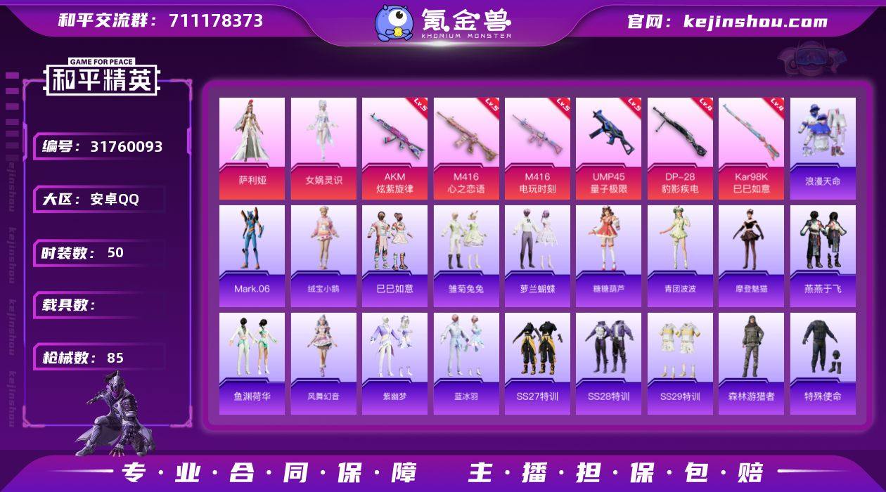 安卓 手Q-2粉装-6特效枪-0载具-0粉色飞行器-24192热力值-7王牌印记-50套装-85枪皮 【热门品类】:套装-浪漫天命,角色-Mark.06 【粉色套装】:角色-萨利娅,角色-女娲灵识 【粉色枪皮等级】:AKM-炫紫旋律(五级),M416-心之恋语(五级),M416-电玩时刻(五级),UMP45-量子极限(五级),Kar98K-巳巳如意(四级),DP-28-豹影疾电(四级) 【粉色枪皮】:AKM-炫紫旋律,M416-心之恋语,M416-电玩时刻,UMP45-量子极限,Kar98K-巳巳如意,DP-28-豹影疾电 【粉色降落伞】:江南烟雨降落伞,创世·救赎降落伞,初号机 觉醒Ver.降落伞,拳皇·狂花道降落伞,千金淑猫降落伞,星穹咏叹调降落伞 【稀有套装】:套装-绒宝小鹅,套装-巳巳如意,套装-雏菊兔兔,套装-萝兰蝴蝶,套装-糖糖葫芦,套装-青团波波,角色-摩登魅猫,套装-燕燕于飞,套装-鱼渊荷华,套装-风舞幻音,套装-紫幽梦,套装-蓝冰羽 【稀有枪皮】:AKM-江南烟雨,M16A4-千金淑猫,SCAR-L-炫彩节奏,SCAR-L-黄金龙骨,M762-天降萌叽,蜜獾-天降萌叽,UZI-啾咪啾咪,UZI-天降萌叽,UMP45-生命誓言,Vector-焰鹰斗篷,汤姆逊-天降萌叽,P90-巳巳如意,M24-奇异狩猎者,AWM-焰鹰斗篷,SKS-炫彩节奏,S686-巳巳如意,S686-千金淑猫,S1897-荧海星豚,DBS-焰鹰斗篷,DP-28-焰鹰斗篷,DP-28-彩虹符号,DP-28-彩虹独角兽,MG3-幻世战舞者,P1911-小狗蛇点点,短管霰弹-星穹咏叹调,TMP-9-江南烟雨,战术弩-江南烟雨,破片手榴弹-巳巳如意 【其他套装】:套装-SS27特训,套装-SS28特训,套装-SS29特训,套装-森林游猎者,套装-浪漫天命,套装-特殊使命,套装-狂沙舞者,套装-猛禽,套装-疯狂小兔子,套装-破蛋小黄鸡,套装-竞技名士,套装-缤纷果语,套装-长空猛禽,套装-鹤鸣,套装-贵族骑装,套装-香榭午后,套装-焰鹰斗篷,套装-幻羽潜行,角色-白光莹,套装-纯真浪花,套...