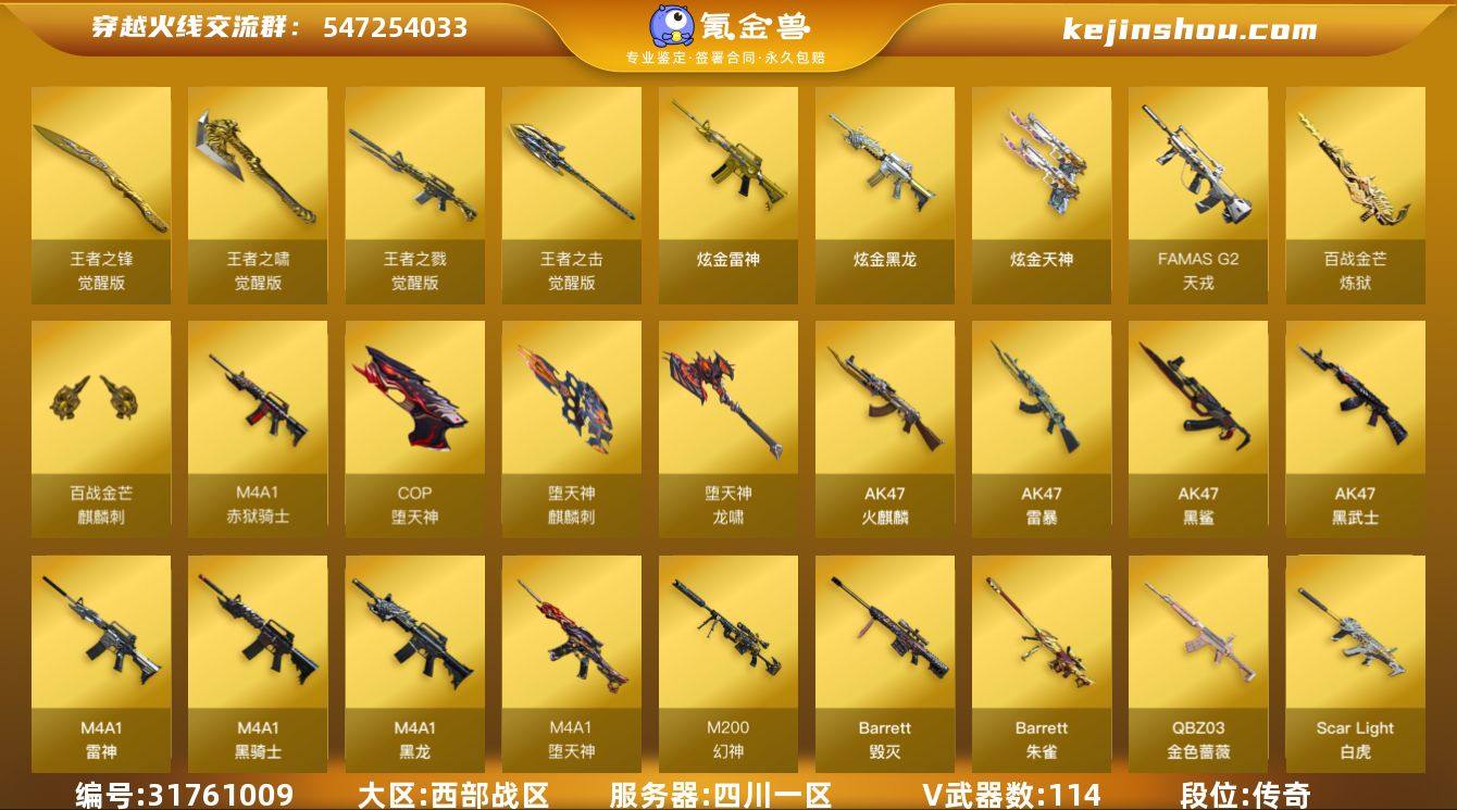 【ky5928】陕西一区-128V-5王者武器数-3炫金武器数 【热门武器】:QBZ03-金色蔷薇,Scar Light-白虎,M200-幻神,M200-竞技荣光,M4A1-黑骑士,汤姆逊-烈龙*6,加特林-炼狱,斯泰尔-蝴蝶,USP-雷暴*2,COP-堕天神*3,沙鹰-修罗*3,金刚伞 【王者炫金武器】:炫金黑龙,炫金雷神,炫金天神 【音效卡】:M200-幻神音效卡,AK47-火麒麟音效卡,M4A1-雷神音效卡,M4A1-黑骑士音效卡,Barrett-毁灭音效卡,炼狱-百战金芒-庆典舞曲音效卡,柯尔特-百战金芒-庆典舞曲音效卡 【皮肤】:幻神-AG-CFPLS17冠军,雷神-暗月,M4A1-战神赵云,M4A1-再燃火线,火麒麟-战神关羽,毁灭耀金皮肤*2,毁灭-英雄计划 皮肤,AK47-B-常胜将军-刘备*2,AK47-B-常胜将军-孙权,轻型军用手斧-再燃火线 【角色】:葵,樱,魅影,炫,春,电竞教官-云悠悠,王者-瞳-闭月羞花,王者-葵-貂蝉,暗夜-X,风暴女,灵狐者-职业经理,青霞仙子,职业选手 【人偶武器】:斯泰尔-蝴蝶,巴雷特-零-水下丽影,迷你深渊冰龙,迷你牛牛,闪光弹-貂蝉,高爆手雷-大乔 【暴走生化】:超级对讲机 【挑战大师】:火狱乱世-超越Max,激光毁灭者III-白马银枪,激光毁灭者III,机甲撕裂者III,神圣爆裂者-末日III 【英雄级武器】:AK47-火麒麟,M4A1-黑龙,M4A1-雷神,M4A1-黑骑士,AK47-黑武士,AK47-黑鲨*3,AK47-雷暴,M4A1-堕天神*2,Scar Light-白虎,FAMAS G2-天戎,QBZ03-金色蔷薇,王者之戮-觉醒版,AK-47-猩红传说,AK47-B-常胜将军,Barrett-毁灭*2,M200-幻神,Barrett-朱雀,M200-竞技荣光,加特林-炼狱,炼狱-百战金芒,汤姆逊-烈龙*6,沙鹰-修罗*3,沙鹰-天神,USP-雷暴*2,COP-堕天神*3,柯尔特-竞技荣光,屠龙*4,龙啸,麒麟刺-堕天神*3,擎天,麒麟刺,幻灵之锋*2,擎天-竞技荣光,龙啸-堕天神,斩神刀-雷暴,麒麟刺-百战金芒,王者之锋-觉醒版,...