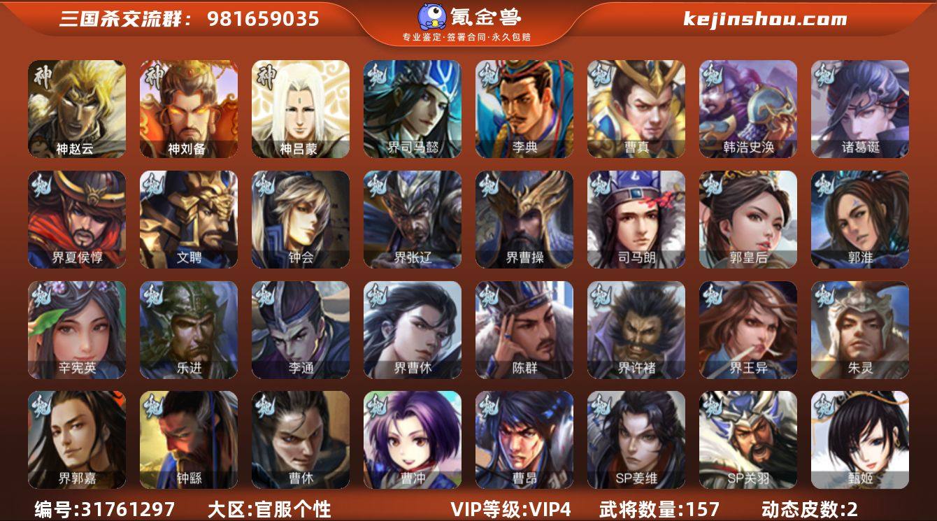 大材料先锋,41宝珠,8.9万羽毛,1.4万将魂,7.8万豆,势于吉,神赵云,神刘备,谯周4史诗,神吕蒙,sp赵云,甘夫人,鲁肃,带皮关银屏,界吕布,张布,界关羽,界曹植,界曹休,金皮界王异,界孙休,界朱治,孙邵,彭恙,友庞统,界刘表,孔融157将,国战52将,满级活树