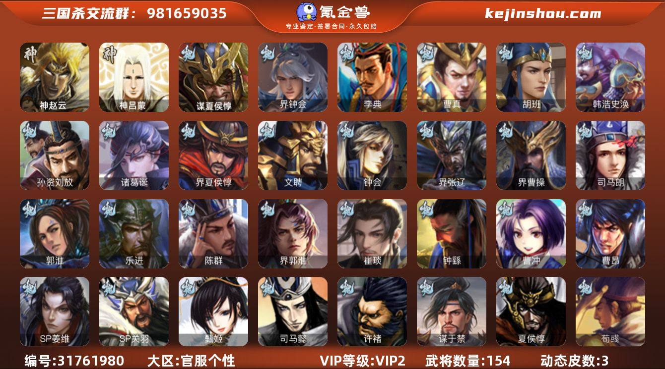 大材料先锋,49宝珠,9.4万羽毛,9千将魂,谋夏侯惇,金皮神赵云,界钟会,花鬘4史诗,神吕蒙,天工吴柯,动态界大乔,甘夫人,关银屏,谋高顺,朱㑺,sp赵云,界孙休,谋于禁,崔琰,势陈祗,势陈到,胡班,彭恙,界张嶷,刘巴,界马超,界伏皇后,张布,贾充,王濬154将,国战58将,7.4万豆,满级活树