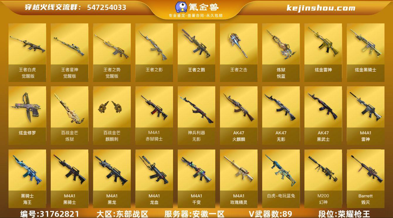安徽一区-98V-9王者武器数-6炫金武器数 【热门武器】:QBZ03-金色蔷薇,M14EBR-玄武,Scar Light-白虎,HK417-朱雀,M4A1-青龙,M200-幻神,死亡之眼*3,白虎-电玩蓝兔,柯尔特-冠军之特,M4A1-黑骑士,汤姆逊-烈龙*6,RPK-盘龙*5,加特林-炼狱,斯泰尔-蝴蝶,沙鹰-修罗*5,Knife-冠军之刃,黄金猫猫手套-白鲨 【王者炫金武器】:王者之戮,王者之影,炼狱-悦蓝,王者之击,炫金骑士,炫金雷神,炫金修罗*4 【音效卡】:M200-幻神音效卡,AK47-火麒麟音效卡*2,M4A1-雷神音效卡,M4A1-黑骑士音效卡*2,Barrett-毁灭音效卡,QBZ03-金色蔷薇音效卡,炼狱-百战金芒-庆典舞曲音效卡 【皮肤】:幻神-动感闪耀 皮肤,QBZ03-冠军之薇,雷神-荣耀之魄,雷神-虎将,雷神-宇航兔皮肤,M4A1-再燃火线,火麒麟-AG战队皮肤,火麒麟-轻羽皮肤,火麒麟-平天大圣,火麒麟-心动糖果,毁灭-荣耀之怒,毁灭耀金皮肤,毁灭-黑大圣皮肤,M4A1-千变-孔明皮肤*2,黑龙-冠军之武,黑骑士耀金皮肤,黑骑士-冠军之势,黑骑士-AG-S4冠军典藏,战神-流金岁月皮肤,AK47-B-常胜将军-孙权,炼狱-玩具枪皮肤,轻型军用手斧-再燃火线 【角色】:魅影,雨棠,鹰,王者-瞳-闭月羞花,王者涂鸦,乔伊教练,修道士,云海玲珑,炽天使,暗夜-X,北极狐-X,芳心审判者,嘉年华灵狐,娟娟,灵狐者-X,灵狐者-七夕宝贝,麻雀,曼陀罗-礼服,潘多拉-X,邱刚敖,斯沃特-X,蜀雪,兔囡囡,夜玫瑰-幻能朋克,樱-战斗天使,职业选手 【人偶武器】:M4A1-雷神-精英刀锋,斯泰尔-蝴蝶,AWM-灵狐-15周年嘉年华,迷你深渊冰龙,迷你生化手雷,生化手雷-机甲核心,迷你超能女侍 【暴走生化】:死亡之眼*3 【挑战大师】:冰龙粉碎者-白马银枪,激光毁灭者III-白马银枪,激光毁灭者III,神圣爆裂者-末日III*2 【英雄级武器】:M4A1-千变*6,AK47-火麒麟*3,M4A1-黑龙,M...