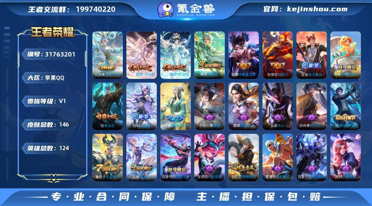 苹果Q-V0-尊贵铂金III段位-124英雄-146皮肤-6传说-32史诗 【传说皮肤】:公孙离云诺千山,妲己愿照众生和,虞姬愿照岁时盈,桑启鸣野蒿,貂蝉仲夏夜之梦,孙悟空地狱火XS20251223 【限定皮肤】:狄仁杰阴阳师,赵云皇家上将,钟无艳超时空战士,白起夜都怪侠,元歌无心,甄姬落雪兰心,狄仁杰魔术师,项羽海滩派对,兰陵王金庭之子,李元芳云中旅人,鬼谷子五谷丰年,铠青龙志,沈梦溪大漠名商,明世隐吟游魔法,裴擒虎擒涛扼浪,嫦娥暖冬兔眠,鲁班大师探海日志,桑启海盐诗旅,张良古海寻踪,鬼谷子天穹祈灯,鲁班七号蔬乡物语,李元芳蔬乡物语,刘邦剑破天穹,程咬金群星魔术团,周瑜熔金海岸 【年限皮肤】:铠青龙志,妲己愿照众生和,虞姬愿照岁时盈 【赛季限定】:兰陵王金庭之子,沈梦溪大漠名商,李元芳云中旅人,桑启海盐诗旅,裴擒虎擒涛扼浪,鲁班大师探海日志,张良古海寻踪,鬼谷子天穹祈灯,刘邦剑破天穹,东皇太一噬灭天穹,太乙真人谧流熔炉,钟馗虚灵犬护 【战令限定】:明世隐吟游魔法,白起夜都怪侠,钟无艳超时空战士,甄姬落雪兰心,嫦娥暖冬兔眠,鲁班七号蔬乡物语,李元芳蔬乡物语,百里守约百相守梦,老夫子百相守梦,孙膑茶境仙,马超访茗客,刘禅鸭鸭历险记,沈梦溪鸭鸭历险记 【史诗皮肤】:露娜紫霞仙子,赵云皇家上将,狄仁杰魔术师,宫本武藏鬼剑武藏,孙尚香水果甜心,妲己魅力维加斯,墨子金属风暴,张飞乱世虎臣,夏侯惇乘风破浪,兰陵王暗隐猎兽者,亚瑟心灵战警,安琪拉心灵骇客,百里守约特工魅影,铠曙光守护者,阿轲节奏热浪,孙策猫狗日记,铠青龙志,狄仁杰鹰眼统帅,不知火舞魅语,孙尚香时之恋人,明世隐吟游魔法,钟无艳超时空战士,鬼谷子五谷丰年,元歌无心,鲁班七号蔬乡物语,艾琳陌上桑,百里守约百相守梦,孙膑茶境仙,赵怀真器灵浮梦炉,阿轲化蝶舞,刘禅鸭鸭...