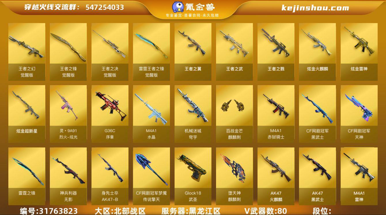 北部战区(黑龙江区)lb【生化爆破挑战三全号】80v【M200-幻神套+皮/星耀,Kar98K-星神套+皮/璀璨,竞技荣光套装,CF网剧冠军武器套装,武圣套装,ScarLight-白虎,QBZ03-金色蔷薇,AWM-裁决+音效卡,5烈龙+6修罗,USP-雷暴,柯尔特-竞技荣光,荣耀世冠-柯尔特,黑龙吞噬者,QBZ03-吕布,Colt1911-大黄蜂,胡萝卜匕首】7王者【王者之翼,王者之幻,王者之戮,王者之武,王者之决,雷霆王者之锋,王者之锋】4炫金【炫金雷神,炫金武士,炫金火麒麟,炫金超新星】10角色【四防电竞教官-云悠悠,葵,炫,零·纪元,战地猎狐,葵-阿尔法武装,奇洋探员,乔伊教练,王者-春,云海玲珑,职业选手】8音效【M200-幻神音效卡,Kar98k-星神音效卡,AWM-裁决音效卡,Barrett-毁灭音效卡,M4A1-雷神音效卡,M4A1-黑骑士音效卡,AK47-火麒麟音效卡,Barrett-碧霄极光音效卡】46皮【幻神-星耀,星神-璀璨,屠龙-星耀,雷神-烈虎,黑骑士-白马银枪,雷神-机甲刑天,雷神-宇航兔,毁灭-风暴,火麒麟-百城,修罗-星空,火麒麟-雷神,毁灭-星空,毁灭-墨兰,毁灭-百城浙江,毁灭-青帝,火麒麟-雷神,雷神-CFS 2019,火麒麟-AG战队,屠龙-荣耀之锋,黑龙-361,毁灭-冠军之怒】挑战枪【腐蚀激光-超越MAX,集束激光-超越MAX】截图展示段位不代表实际段位 如赛季更新等不可抗拒因素发生变化、时限道具不保证所剩时间
