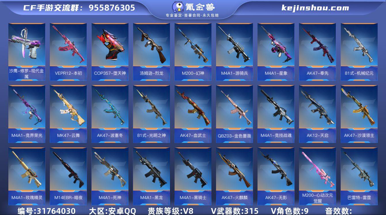 【FC-U1BDUM】15王者-2至尊-1同框-仲康套-幻神套-本初套-游骑兵-星象-奉先-127赏金币 手Q-安卓,等级147,VIP0,V武器数:315 ,V角色数:9 【人物角色】关小雨,太阳神-曦,复仇者,萝拉,零,曼陀罗,斯沃特,祝融夫人,炽天使-X,武媚,蝉, 【王者武器】王者之誉,王者之兽,蝴蝶刀-天神,唐刀-华夏传说,唐刀-华夏传说,唐刀-华夏传说,M12S-雷霆王者,王者之兽手雷,王者之兽手雷,王者之兽手雷,王者之翼闪光弹,王者之兽闪光弹,王者之影闪光弹,王者之兽烟雾弹,王者之影烟雾弹,王者之翼烟雾弹,王者之心,王者之影,王者之翼,王者之戮,王者之魂,王者之啸,王者之迹,王者之腾,王者之仞,王者之隐, 【带V枪械】MK47-云舞-千变,M4A1-竞界荣光,M4A1-星象,M4A1-竞技战魂,沙鹰-火麒麟-Pro Max,M4A1-游骑兵,M4A1-玫瑰精灵,M4A1-玫瑰精灵,M4A1-死神,M4A1-黑龙,M4A1-黑骑士,M4A1-黑骑士,M4A1-雷神,M4A1-雷神,MK47-云舞,AK47-波塞冬,AK47-血武士,AK47-奉先,COP 357-堕天神,AK47-沙漠领主,M4A1-黑龙-苏城钰,AK47-火麒麟,AK47-火麒麟,AK47-火麒麟,AK47-火麒麟,AK47-无影,81式-光明之神,81式-光明之神,81式-机械纪元,M14EBR-暗夜,M4A1-黑骑士-海王,QBZ03-金色蔷薇,98K-黑骑士,AK12-天启,AK12-天启,M200-心动次元觉醒,M200-幻神,巴雷特-雷霆,巴雷特-雷神,巴雷特-极光,巴雷特-极光,巴雷特-极光,巴雷特-极光,09式狙-天神,加特林-蟒蛇,加特林-蟒蛇,加特林-堡垒觉醒,加特林-堡垒,MG36-黑骑士,巴雷特-极光-重型机甲,巴雷特-毁灭-寒霜,巴雷特-毁灭-寒霜,巴雷特-毁灭-能量核心,巴雷特-毁灭-能量核心,双持斯泰尔-天使,双持斯泰尔-天使,汤姆逊-烈龙,VEPR12-本初,双管猎枪-黑骑士,沙鹰-波塞冬,沙鹰-天神,沙鹰-天神,沙鹰-天神,沙鹰-天神,沙鹰-火麒麟,沙...