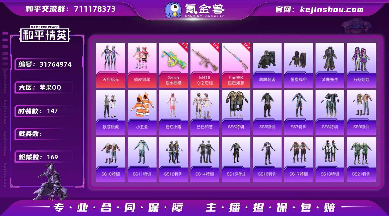【803】苹果 手Q-2粉装-5特效枪-0载具-0粉色飞行器-52954热力值-1王牌印记-147套装-169枪皮 【热门品类】:套装-小丑鱼,套装-粉红小猪 【粉色套装】:粉装-天启纪元,粉装-俏皮狐尾 【粉色枪皮等级】:M416-心之恋语(六级),GROZA-香水柠檬(七级),Kar98K-巳巳如意(三级) 【粉色枪皮】:M416-心之恋语,GROZA-香水柠檬,Kar98K-巳巳如意,Mk14-福马献瑞 【粉色降落伞】:快乐主宰降落伞,香水柠檬降落伞 【稀有套装】:套装-巳巳如意 【稀有枪皮】:AKM-PEL轰鸣竞梦者,AKM-冰凉西瓜,AKM-夜灯,AKM-春暖花开,AKM-生命誓言,AKM-破晓战魂,AKM-萌趣颜团子,AKM-虎虎生威,AKM-霓虹街区,M16A4-幻世战舞者,M16A4-机械英豪,SCAR-L-玉兔迎春,SCAR-L-甜蜜誓约,SCAR-L-红色方程式,M416-夜灯,M416-红色方程式,M416-蓝色火焰,GROZA-彩虹符号,GROZA-暗夜武装,GROZA-治愈之星,GROZA-黑色刀锋,QBZ-原初圣火,QBZ-诡娃娃,M762-天降萌叽,M762-拳皇97,M762-瑞龙福将,M762-诡娃娃,M762-镭射皇者,M762-魅夜紫皇,G36C-不夜海上花,G36C-时空追击者,G36C-暗夜玫瑰,蜜獾-娇憨猪猪,UZI-众神之王,UZI-娇憨猪猪,UZI-影袭,UZI-炫彩节奏,UZI-烈焰拳霸,UZI-生命誓言,UZI-金风玉露,UMP45-夜灯,UMP45-时空追击者,UMP45-生命誓言,UMP45-诡娃娃,Vector-彩虹符号,Vector-暗夜玫瑰,Vector-治愈之星,Vector-生命誓言,Vector-香水柠檬,Vector-黑色刀锋,汤姆逊-勇闯险境,野牛-机械英豪,MP5K-众神之王,MP5K-怪笑疯兔,MP5K-甜蜜誓约,MP5K-繁花小夜曲,Kar98K-勇闯险境,Kar98K-彩虹符号,M24-治愈之星,M24-香水柠檬,M24-众神之王,M24-冰封烈焰,AWM-王牌四分卫,SKS-勇闯险境,SKS-夜灯,SKS-时空追击者,SKS-炫彩节奏,SKS-诡娃娃,VSS-繁花小夜曲,VSS-镭射皇者,VSS-黑色刀锋,Mini14-原初圣火,...
