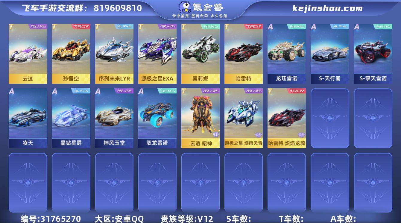 B652522 【特价-竞速6机甲/云逍昭神+哈雷特炽焰龙骑+源极烟雨天青+序列未来+孙悟空+奥莉娜+擎天雷诺/天行者-全强宠/雪域狮王+机甲金刚+源梦之星+小悟空+铠甲战士-多紫装服饰】 游戏等级80 T车数量6 【否】 【可二次实名】 【永久包赔】 【安卓QQ】 稀有车型4 稀有永久A车2 T车皮肤2 魔法时装1 永久T车6 宠物5 稀有车型:擎天雷诺,神风玉堂,孙悟空,哈雷特; 稀有永久A车:驭龙雷诺,龙珏雷诺; T车皮肤:哈雷特炽焰龙骑,源极之星烟雨天青; 魔法时装:皓月霜华; 永久T车:源极之星EXA,序列未来LYR,孙悟空,奥莉娜,哈雷特,云逍; 宠物:雪域狮王,机甲金刚,源梦之星,小悟空,铠甲战士;