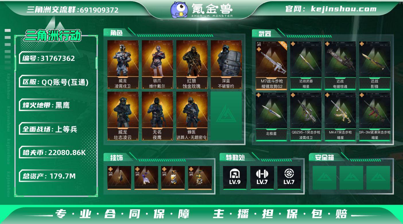 实名:不可二次实名 总资产:179.7M 哈夫币:22080.86K 烽火地带段位:黑鹰 烽火地带等级:60 全面战场段位:上等兵 全面战场等级:39 9级仓库,7级训练中心,7级靶场,6级指挥中心,1级潜水中心,3级防具台,3级工作台,3级制药台,3级技术中心,1级收藏室 战术部门等级:3 战斗部门等级:3 医疗部门等级:3 研发部门等级:3 后勤部门等级:4 曼德尔砖-气象感应:0 曼德尔砖-命运王牌:0 曼德尔砖-电玩高手:0 曼德尔砖-美杜莎:0