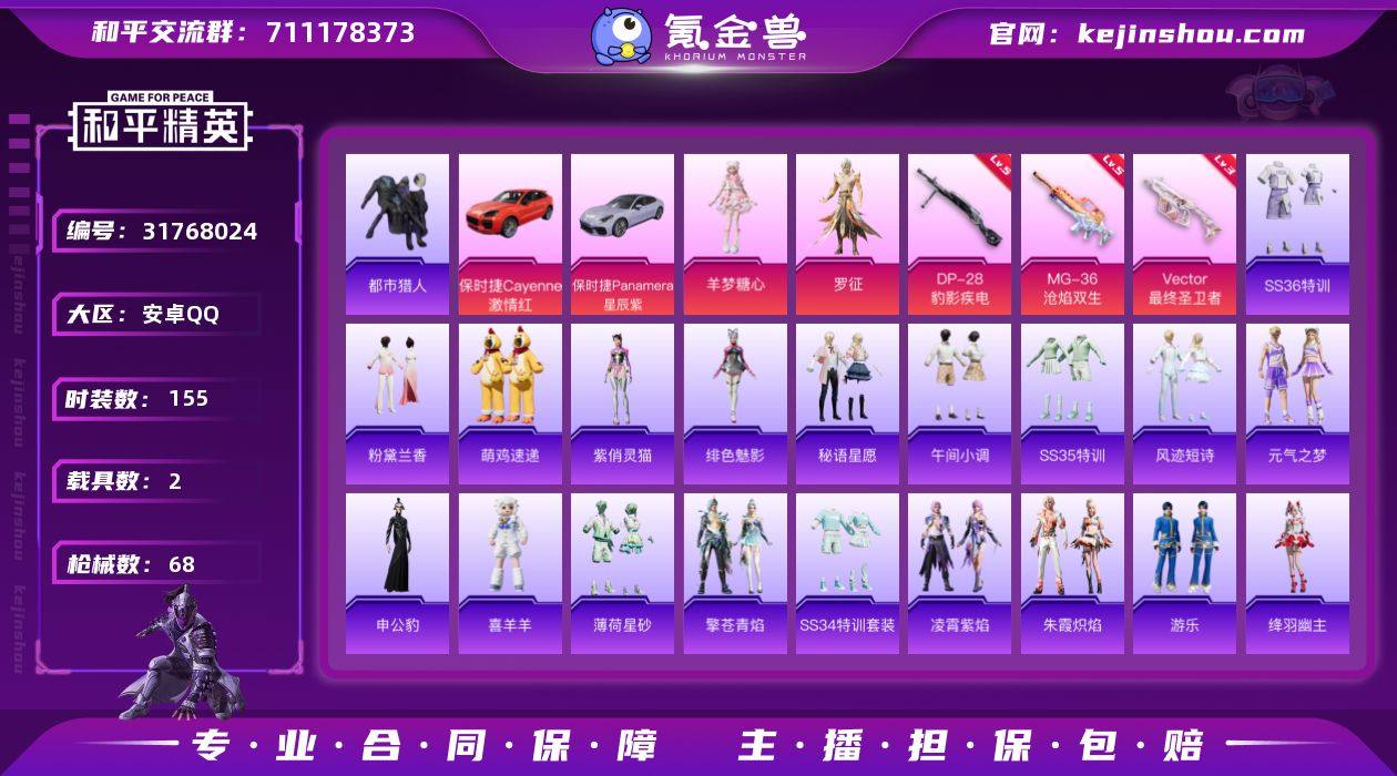 实名:不可二次实名 是否支持人脸包赔:支持 粉装数量:2 特效枪数量:3 载具数:2 时装数:155 枪械数:68 都市猎人 羊梦糖心,罗征 五级DP-28-豹影疾电,五级MG-36-沧焰双生,三级Vector-最终圣卫者 保时捷Cayenne(激情红),保时捷Panamera(星辰紫) 狙击之神,SS36特训,粉黛兰香,绯色魅影,萌鸡速递,紫俏灵猫,风迹短诗,秘语星愿,SS35特训,午间小调,元气之梦,申公豹,喜羊羊,薄荷星砂,凌霄紫焰,擎苍青焰,SS34特训套装,游乐,朱霞炽焰,冰冻风暴,滨海厨神,彩虹兔,都市猎人,贵族骑装,街头潮人,绛羽幽主,蓝调潮人,灵公主,柠萌假日,破蛋小黄鸡,绮丽涂鸦,云朵鹅,SS33特训套装,雪绒豹,旭日情侣,鹰眼刺客 镜花水月降落伞,炫彩糖果降落伞,异瞳寒姬降落伞,提桶跑路飞行器,时光之誓飞行器,星之彼岸飞行器,终晖之翼飞行器,第五大道降落伞,冷漠罗丽降落伞,洛神天依降落伞,时光之誓降落伞,智趣喵喵降落伞 卖家说:急出
