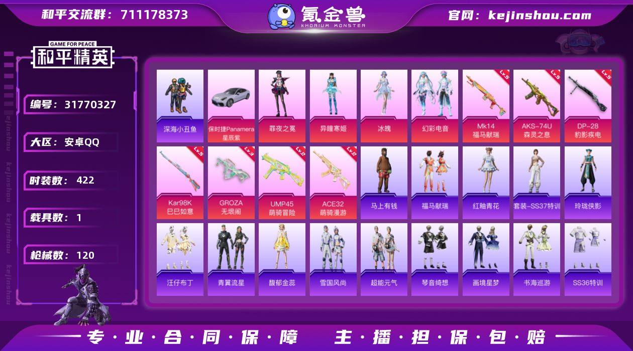 【深海小丑鱼 小丑鱼 浪漫天命 暗影哥特 迅捷狂鲨 兔兔白日梦 狂沙舞者 摩登魅猫 5粉7枪1车 】 实名: 可修改 时装数: 422 载具数: 1 枪械数: 120 战备数: 113 热门装扮: 呆萌铁蟹,深海小丑鱼,迅捷狂鲨,兔兔白日梦,幻彩电音,冰魄,异瞳寒姬,罪夜之冕 载具: 保时捷Panamera(星辰紫) 稀有枪皮: Kar98K-巳巳如意,GROZA-无垠阁,DP-28-豹影疾电,AKS-74U-森灵之息,ACE32-萌骑漫游,UMP45-萌骑冒险