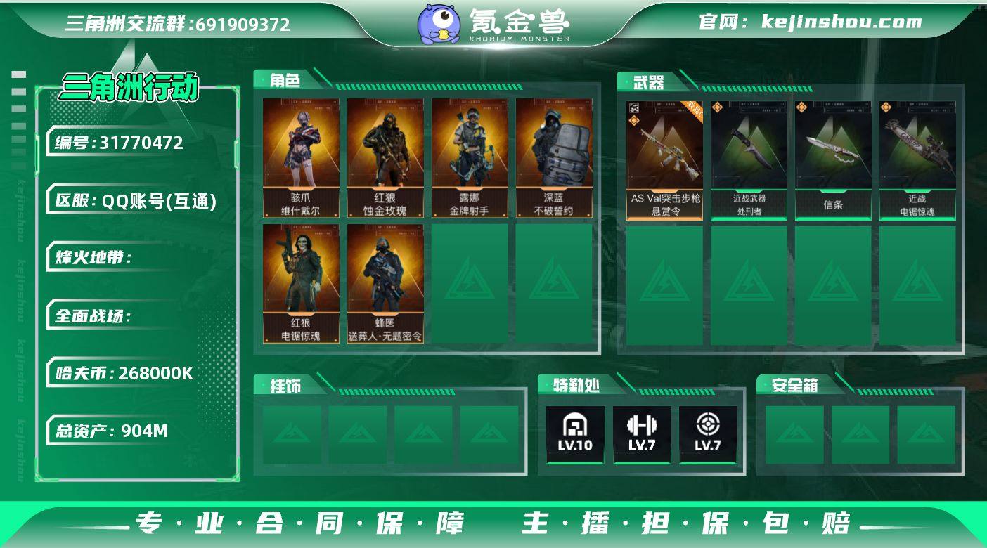 S1207 总资产904M,哈夫币26800w,典藏1 近战4 枪皮数量275,骇爪-维什戴尔/红狼-蚀金玫瑰/露娜-金牌射手/红狼-电锯惊魂/深蓝-不破誓约/蜂医-送葬人无题密令,近战-处刑者/近战-信条/近战-电锯惊魂,AS Val突击步枪-悬赏令(极品C)战场等级50尉官, 行动等级60黑鹰,安全箱等时效性道具请以游戏内数据为准,详情请看图