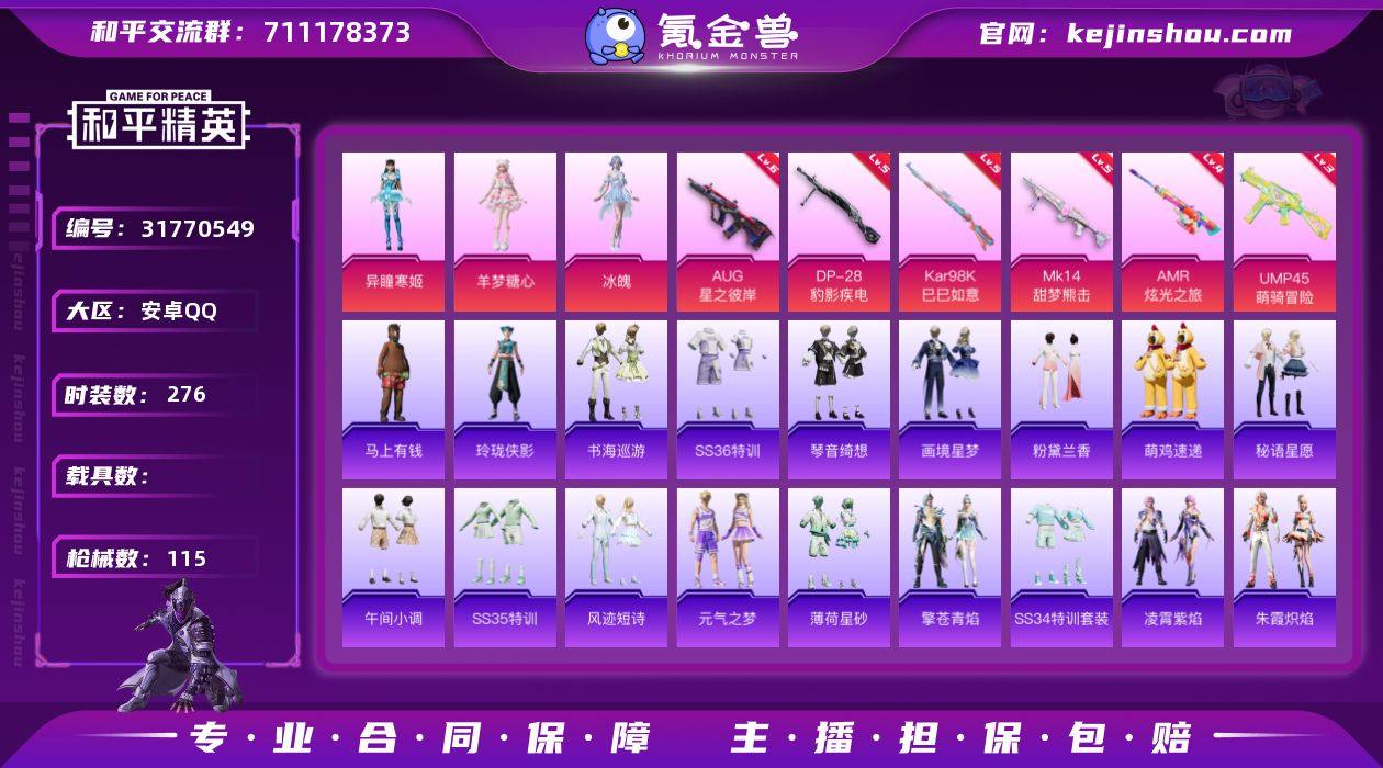 实名:可二次实名 是否支持人脸包赔:支持 粉装数量:3 特效枪数量:6 时装数:276 枪械数:115 异瞳寒姬,羊梦糖心,冰魄 六级AUG-星之彼岸,五级DP-28-豹影疾电,五级Kar98K-巳巳如意,五级MK14-甜梦熊击,四级AMR-炫光之旅,三级UMP45-萌骑冒险 狙击之神,马上有钱,玲珑侠影,画境星梦,琴音绮想,书海巡游,SS36特训,炫彩糖果,粉黛兰香,萌鸡速递,风迹短诗,秘语星愿,SS35特训,午间小调,元气之梦,薄荷星砂,凌霄紫焰,擎苍青焰,SS34特训套装,游乐,朱霞炽焰,暗夜傀儡,缤纷果语,白辉玉蕊,白糯汤圆,白色伏地魔,长空猛禽,春日漫步,大橘大利,淡雅花蕊,福星高照,光之冒险,鹤鸣,虎虎生威吉莉,黑色伏地魔,黄色伏地魔,幻世战舞者,娇憨猪猪,竞技名士,快乐星愿,空投萌叽,蓝冰羽,蓝色守护者,恋语绒绒,冷焰舞者,麻辣教官,萌趣咩咩,柠萌假日,牛气冲天,生化防暴队,SS17特训,SS18特训,SS21特训,SS31特训套装,SS32特训套装,巳巳如意,石蕴玉辉,特训学院,特战装甲,完美偶像,星梦畅游,玉兔迎春,乐音,鱼渊荷华,燕燕于飞,异域银装,智谋强哥,紫幽梦 炫彩糖果降落伞,炫彩糖果飞行器,异瞳寒姬降落伞,星之彼岸飞行器,桃粉嫣然降落伞,星穹咏叹调降落伞,荧海星豚降落伞,樱桃泡泡降落伞,智耀战神降落伞 卖家说:和平精英苹果QQ区连体号,皮肤枪械载具表情包全,成长型资产多,账号状态正常,支持验号,安全靠谱,喜欢收集的可以看看,价格可聊,加香肠派对共号有诸多老版本道具之类。和平精英加307天特权卡