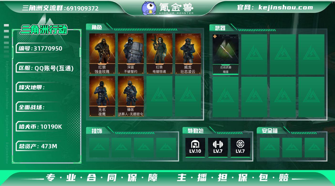 S1217总资产473M,哈夫币1019w,非洲之心,海洋之泪,近战2 枪皮数量310,红狼-蚀金玫瑰/红狼-电锯惊魂/深蓝-不破誓约/无名-夜鹰/威龙-壮志凌云/蜂医-送葬人无题密令,近战-暗星,战场等级50军士长, 行动等级60钻石,安全箱等时效性道具请以游戏内数据为准,详情请看图